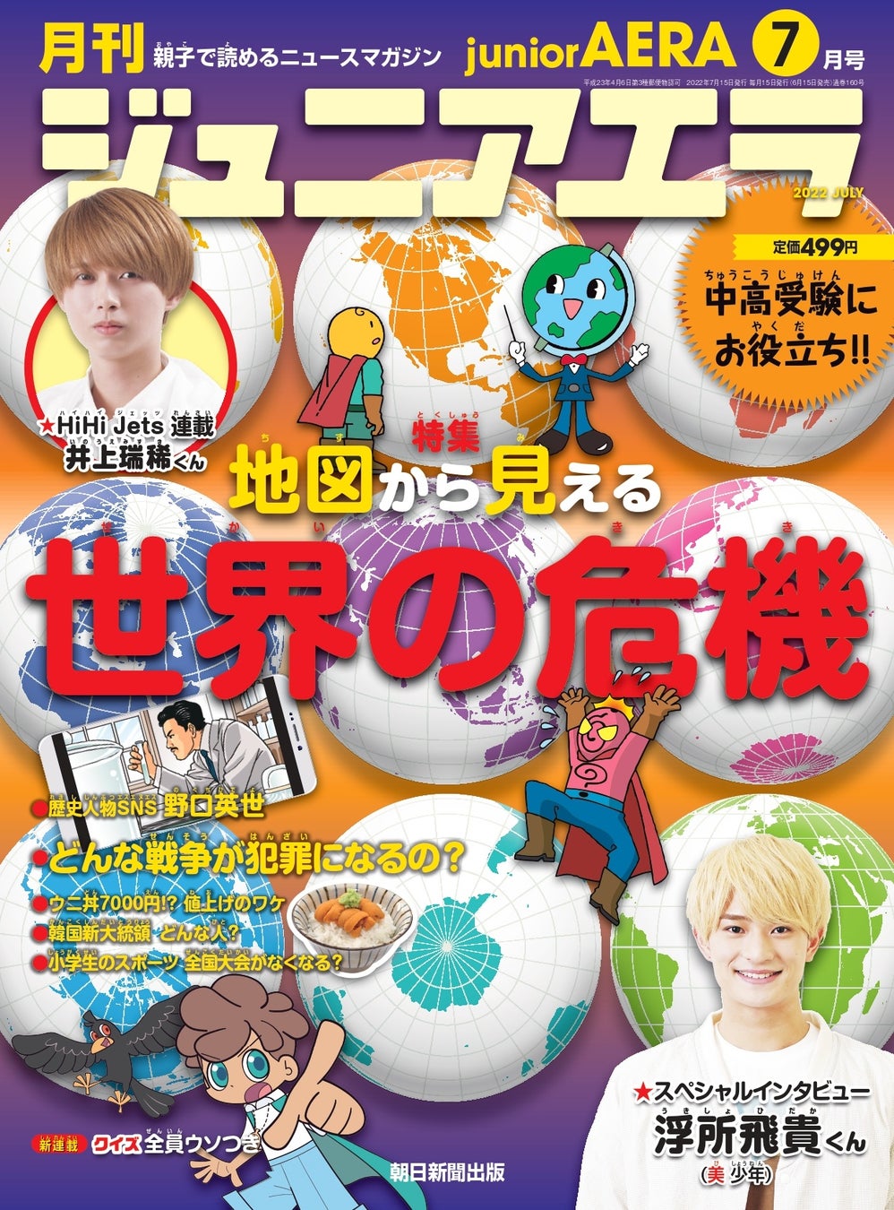 小中学生が親子で読めるニュース月刊誌「ジュニアエラ7月号」が6月15日(水)に発売されました。7月号は、「地図から見える 世界の危機」を特集。このほか、「戦争犯罪とは何か」「小学生のスポーツ全国大会に中止の動き」など、話題のニュースをわかりやすく解説します。スペシャルインタビューには、ジャニーズJr.の人気グループ「美 少年」の浮所飛貴くんが登場。HiHi Jets連載では、井上瑞稀くんが読者の質問に答えています。中学・高校受験に役立ち、学びも楽しさもぎっしり詰まった一冊、ぜひご覧ください!
