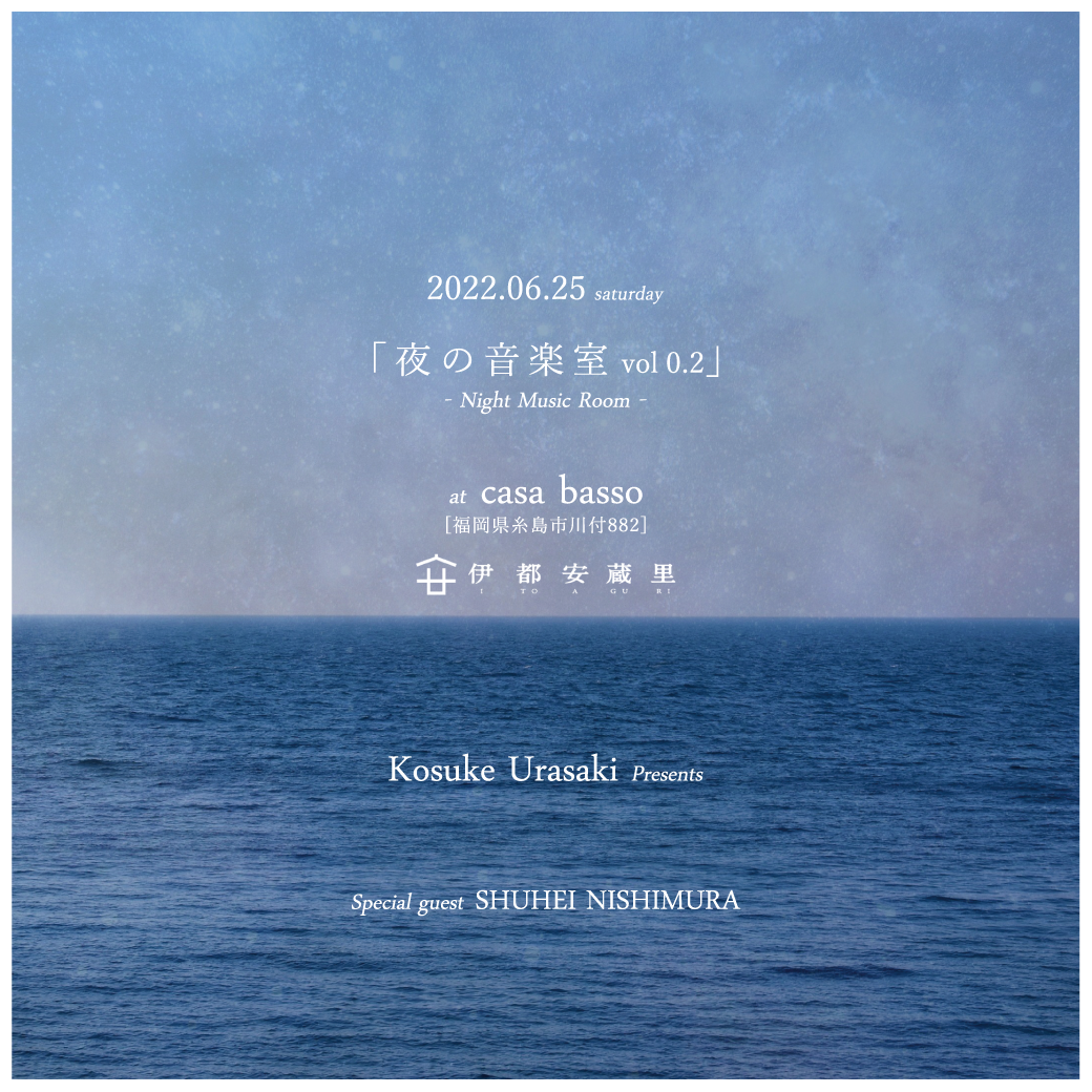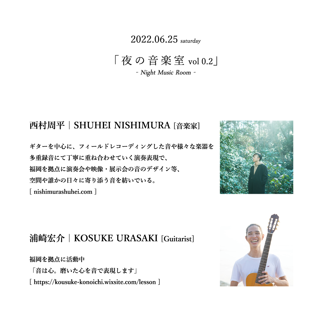 【浦崎宏介×伊都安蔵里】眠れる演奏会「夜の音楽室vol 0.2」を6月25日(土)に開催!スペシャルゲストに西村周平氏を招き、ギターの音色に浸りながら、耳を澄まし、心を澄ますひと時が再び!