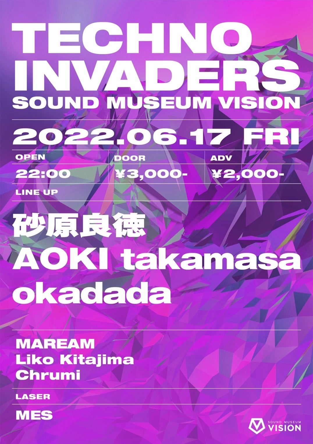 今回のTECHNO INVADERSは、昨年のFUJI ROCKで素晴らしいライブが絶賛だった電気グルーヴの元メンバーであり、マスタリングエンジニアとしてサカナクション、D.A.N.、YMO、高橋幸宏などの作品も手掛ける砂原良徳や、LIVE, DJ、楽曲制作を中心に国際的な活動を続け、写真家としても活動し、Bun/Fumitake TamuraとのユニットNeutralでの活動も進行中のAOKI takamasaが登場。VISIONでも多数のパーティーに出演し、日本全国のクラブやフェスなどに引っ張りだこの人気DJ、okadadaも出演。そしてレジデントを務めるMAREAM、Liko Kitajima、Chrumiら女性DJ陣が華を添える。
