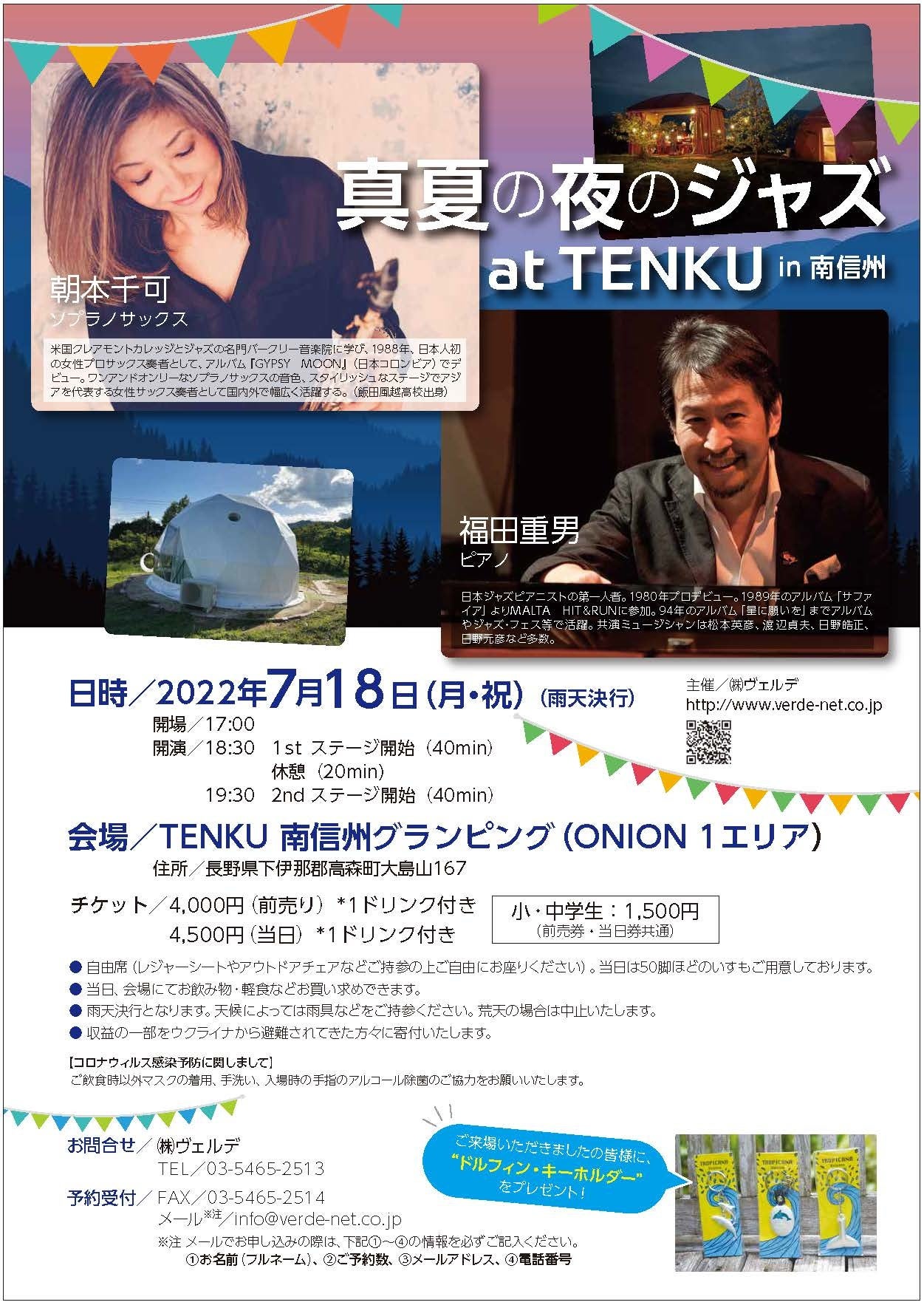 株式会社ヴェルデ(東京都渋谷区、代表:加藤みどり)主催、『真夏の夜のジャズat TENKU in 南信州』が2022年7月18日 (月・祝)にTENKU 南信州グランピング(ONION1エリア)(長野県下伊那郡)にて開催されます。チケットはカンフェティ(運営:ロングランプランニング株式会社、東京都新宿区、代表取締役:榑松 大剛)にて6月15日(水)18:00より発売開始です。