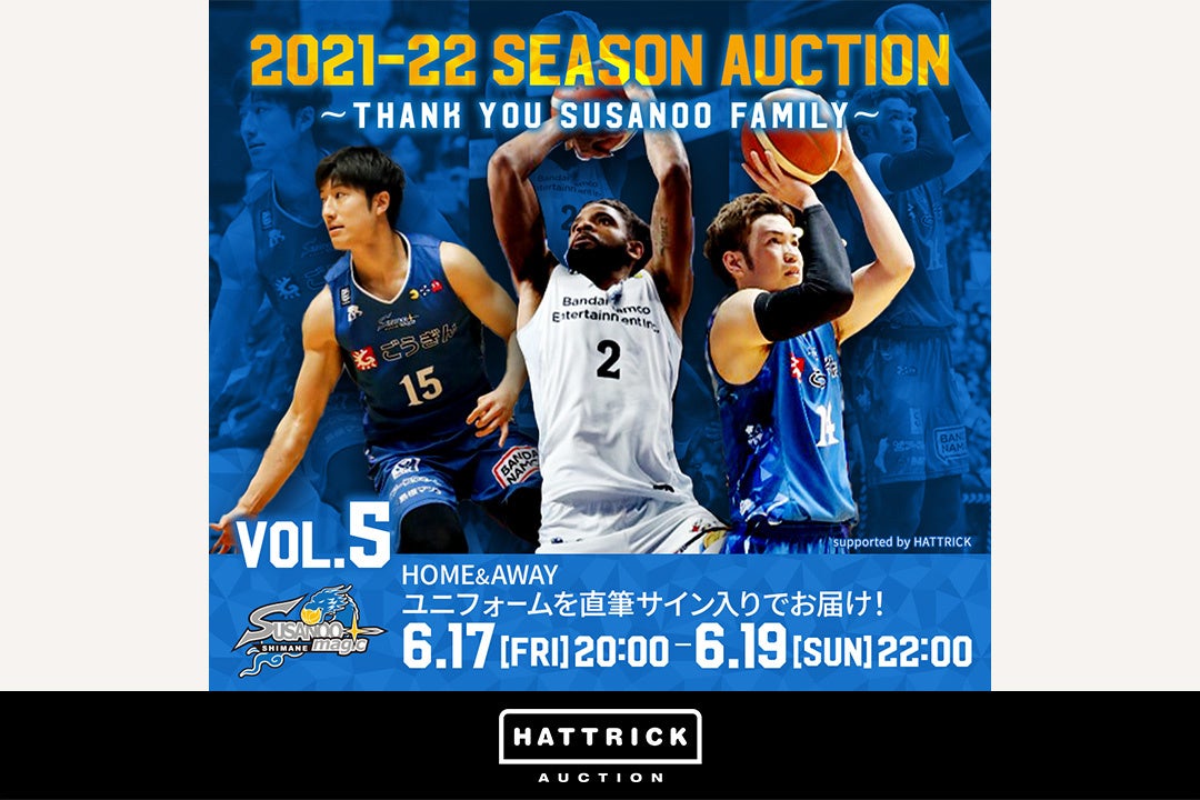 あらゆるステークホルダーへ人生を変える価値を提供し、一人ひとりが「らしく、生きる。」世界の実現を目指すバリュエンスジャパン株式会社(本社:東京都港区、代表:六車 進、以下 当社)は、同社が運営するスポーツチーム公認オークション「HATTRICK(https://auction.hattrick.world/)」にて、島根スサノオマジック・2021-22シーズンオークション~THANK YOU SUSANOO FAMILY~を開催中。そして、2022年6月17日(金)より【第5弾】を開催いたします。