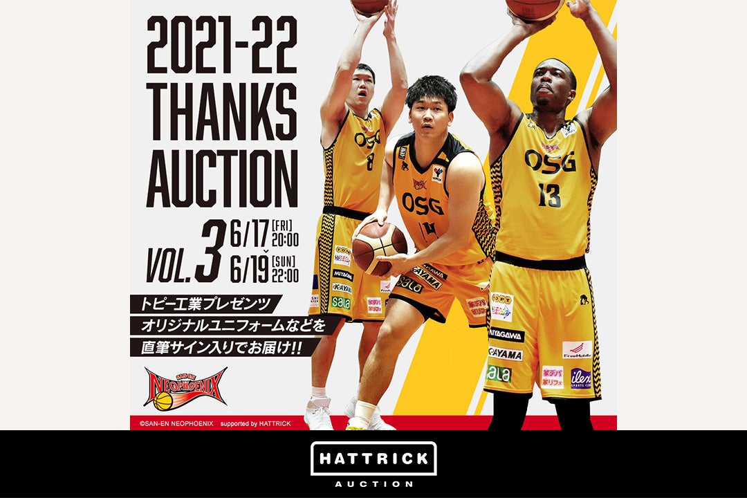 あらゆるステークホルダーへ人生を変える価値を提供し、一人ひとりが「らしく、生きる。」世界の実現を目指すバリュエンスジャパン株式会社(本社:東京都港区、代表:六車 進、以下 当社)は、同社が運営するスポーツチーム公認オークション「HATTRICK(https://auction.hattrick.world/)」にて、三遠ネオフェニックス 2021-22シーズン ブースター感謝オークションを開催中。そして、2022年6月17日(金)より第3弾、6月21日(火)より第4弾、6月24日(金)より第5弾を開催いたします。