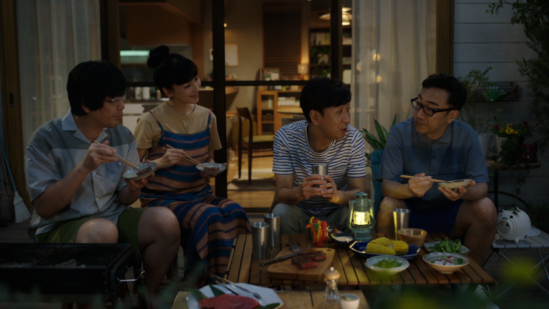 庭での食事を楽しむ4人。飯塚さんが「野球とかもさ、自分でやるより見るほうが好きなんだよ」と話すと、「プロレスとかそうだね、僕も」と豊本さんと盛り上がります。「ふるさと納税だよ、人のふるさと納税見るってなんだよ」と言う角田さんに「見ます?」と東京03のコントを彷彿とさせるユーモアあふれる返しをする麻生さん。言われた通りお礼品を眺める飯塚さんと豊本さんに「何してんだよ」と角田さんらしいツッコみが入るコミカルな内容になっています。