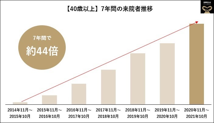 また【当院の創業年(2014年)からみた7年間の40代以上の男性来院者推移】では、約44倍に増加しています。