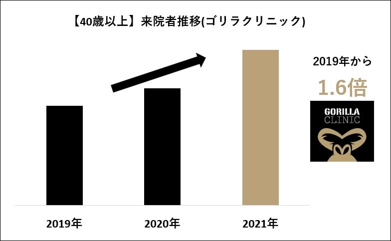 以前は患者さまの中心は20~30代のビジネスマンでしたが、コロナ禍以降40代以上の男性患者さまは顕著に増加し、「2019年度」と「2021年度」それぞれ1年間の来院者数と比較すると、1.6倍に増加しています。