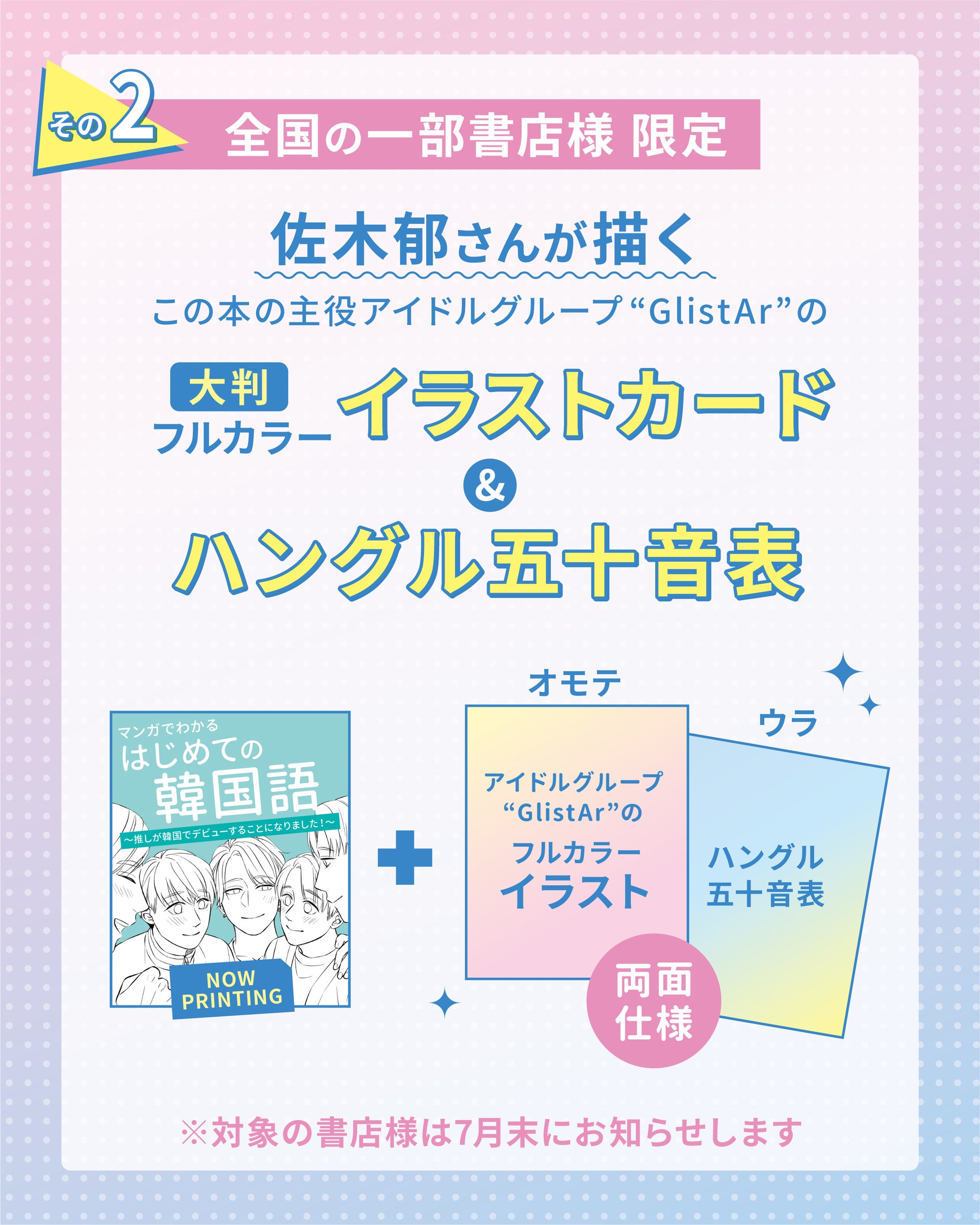 また、全国の一部書店(※)では佐木郁さんが描くアイドルグループ「GlistAr」の大判イラストカードを特典としてご用意。裏面はハングル五十音表になっており、実用性にも優れた1枚です。