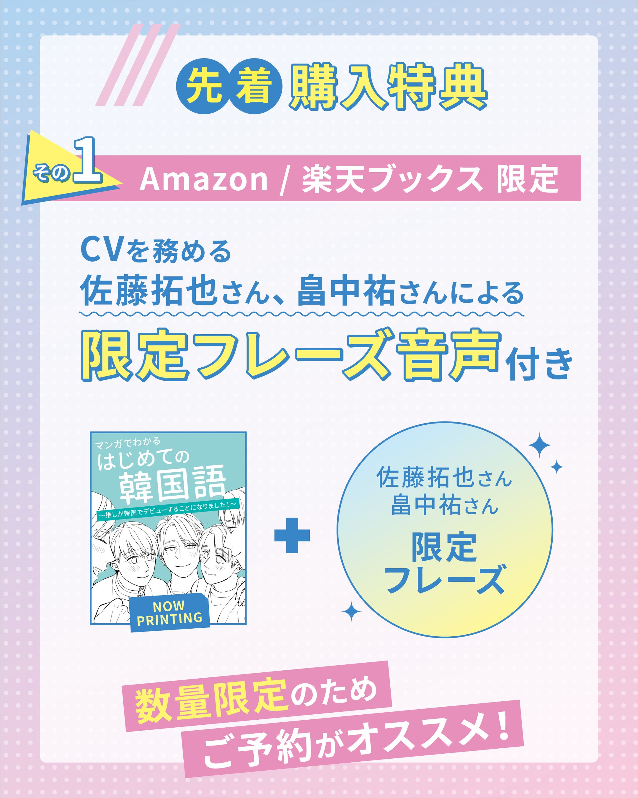 発売を記念して、Amazonと楽天ブックスでは本編未収録の特典フレーズ付きを販売。佐藤拓也さんと畠中祐さんによる“韓国ドラマ風(一度は言われてみたい)胸キュンフレーズ”を聴くことが出来ます。