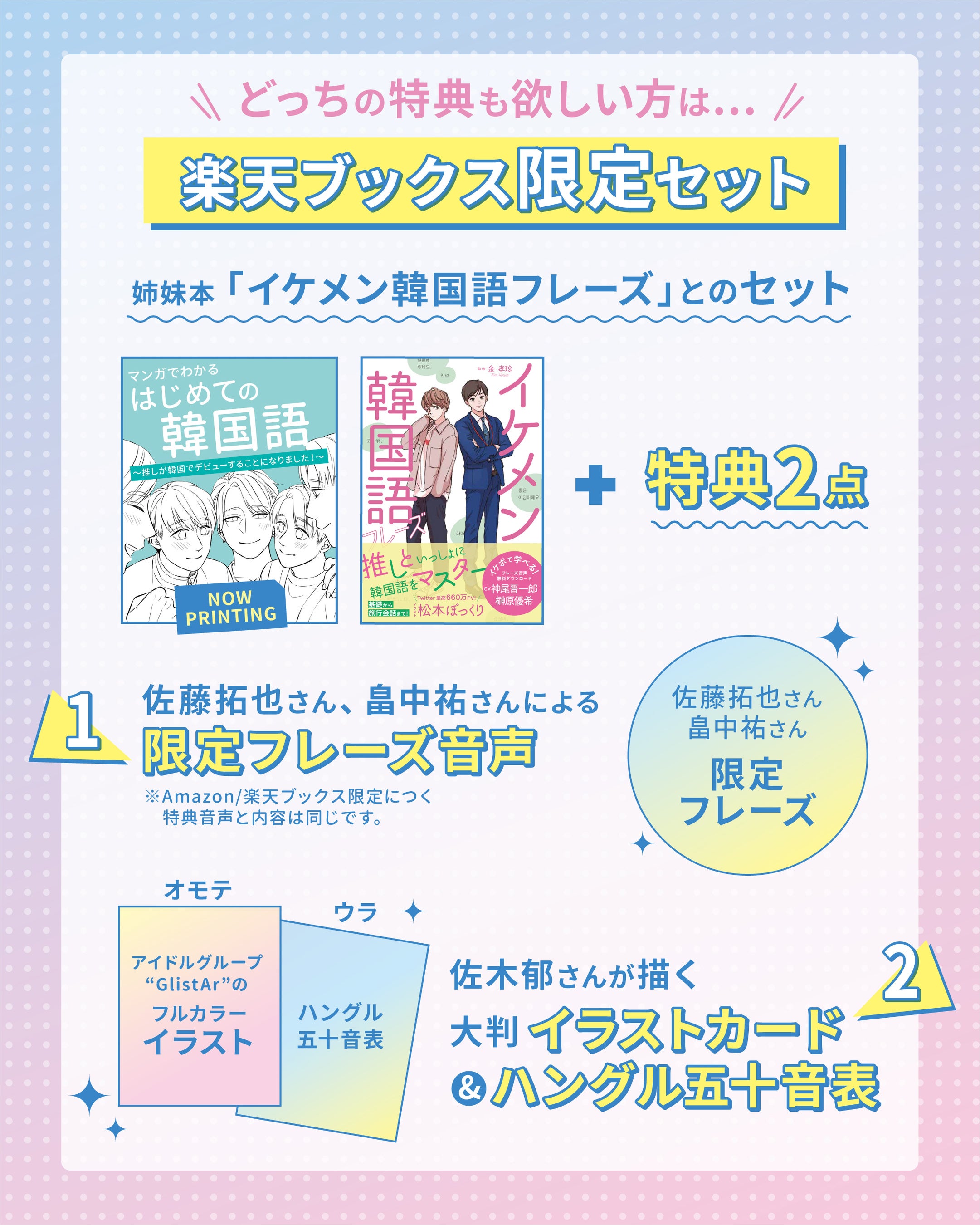 音声特典、イラストカード共にゲットしたい方には楽天ブックスのセットがおススメです。姉妹本『イケメン韓国語フレーズ』と本書のセットをご購入で、W特典をどちらも手に入れることが出来ます。