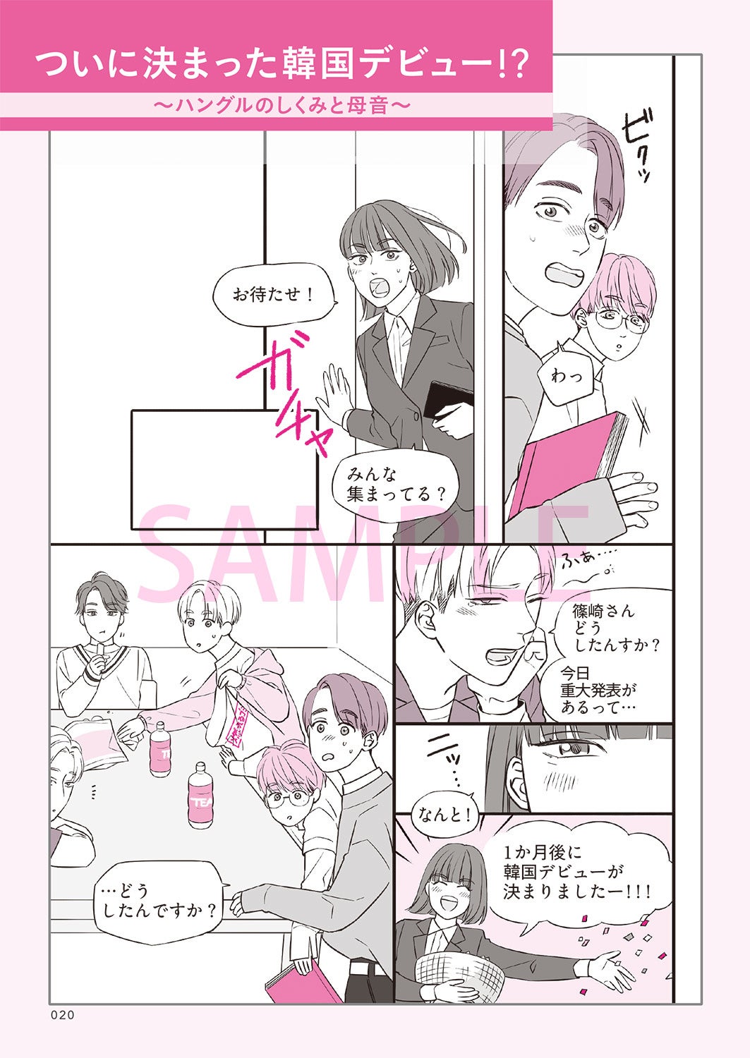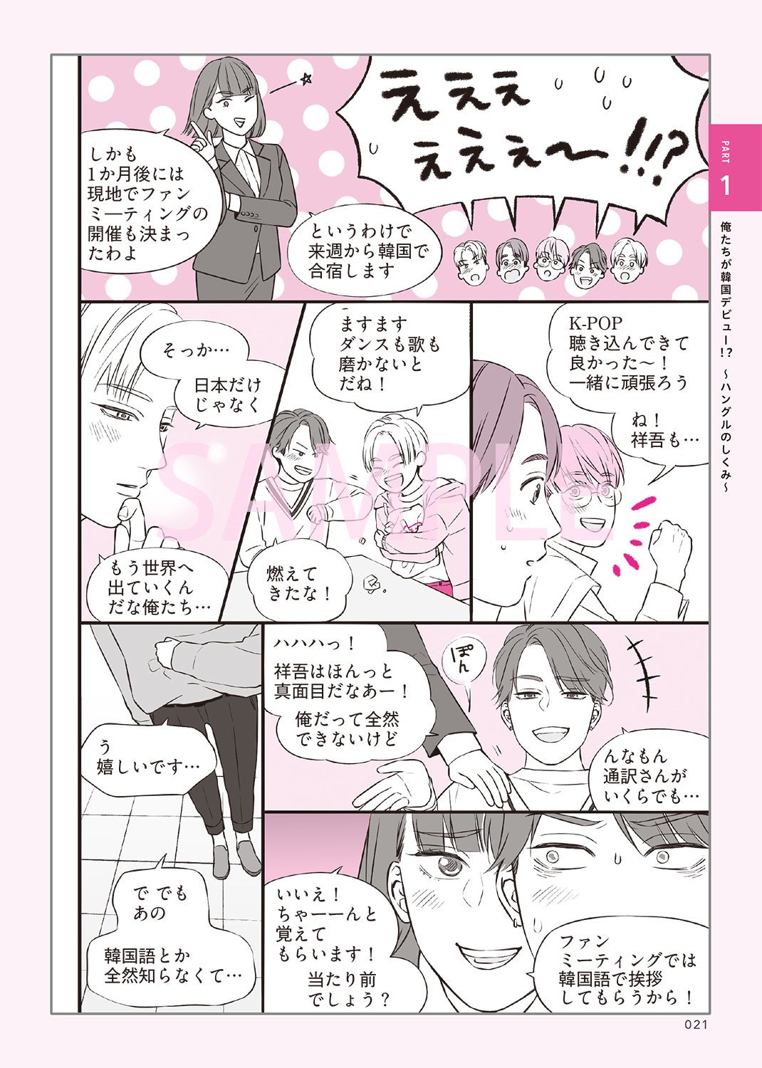 本書はマンガ+解説で、より楽しく読み進められる点が特徴。突然マネージャーから韓国デビューを告げられたアイドルグループ「GlistAr」が、現地でのファンミーティングに向けイチから韓国語を学ぶストーリーが展開します。