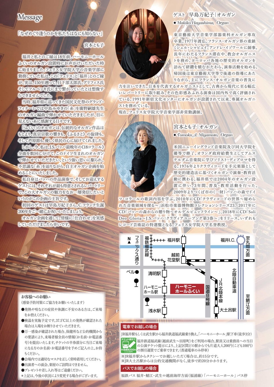 Fukui Pipe Organ Projectではハーモニーホールふくいに 2004 年度に設置された国内最大規模のパイプオルガンの音楽企画が近年減少していることを受け、この楽器の魅力をなお一層福井県民の皆様と分かち合うために、オルガニストである宮本とも子が定期的に自主企画公演を行います。