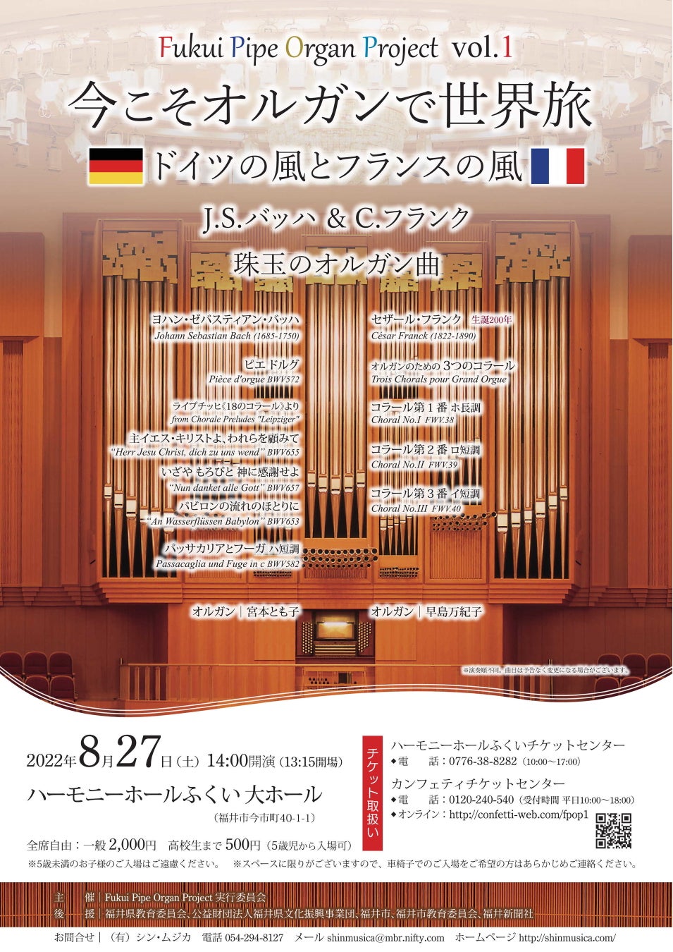 Fukui Pipe Organ Project 実行委員会主催、『今こそオルガンで世界旅~ドイツの風とフランスの風~ J.S.バッハ & C.フランク 珠玉のオルガン曲』が2022年8月27日(土)にハーモニーホールふくい 大ホール(福井市)にて開催されます。