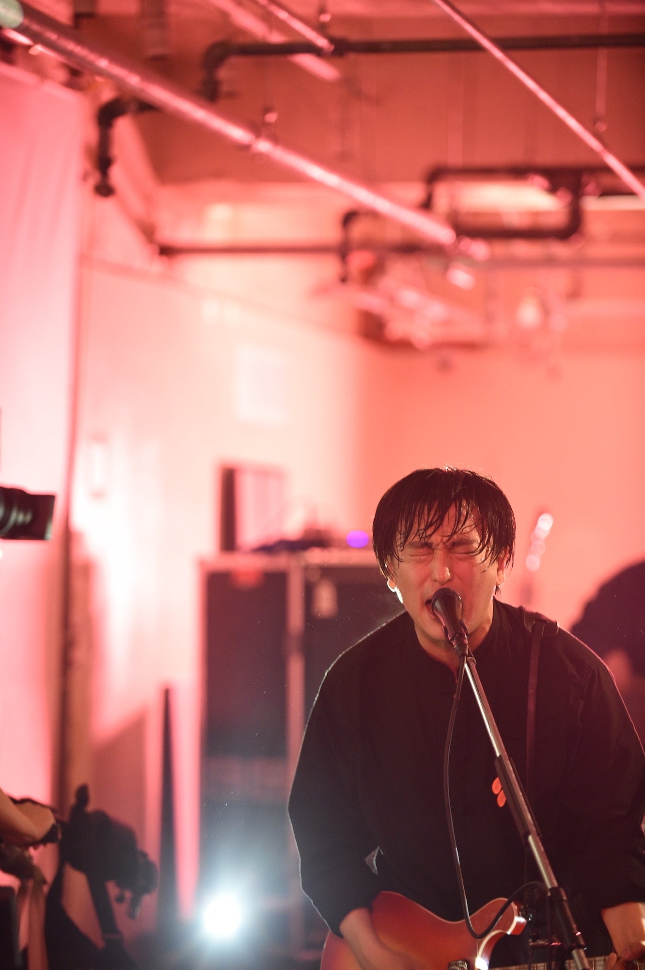 縦長のスペースなので奥から吉田、ベースの森夏彦、ギターの加藤綾太が並び、先頭に古舘。あんまり見たことのない配置で、アイコンタクトとか取りづらいんじゃないの、とも思うのだが、そんなことものともしない勢いと阿吽の呼吸でパンクな「ルシファー」にセンチメンタルな「急行電車」と、彼らのライブでは鉄板の楽曲を畳み掛けていく序盤。古舘の前髪はあっという間に汗まみれになっている。