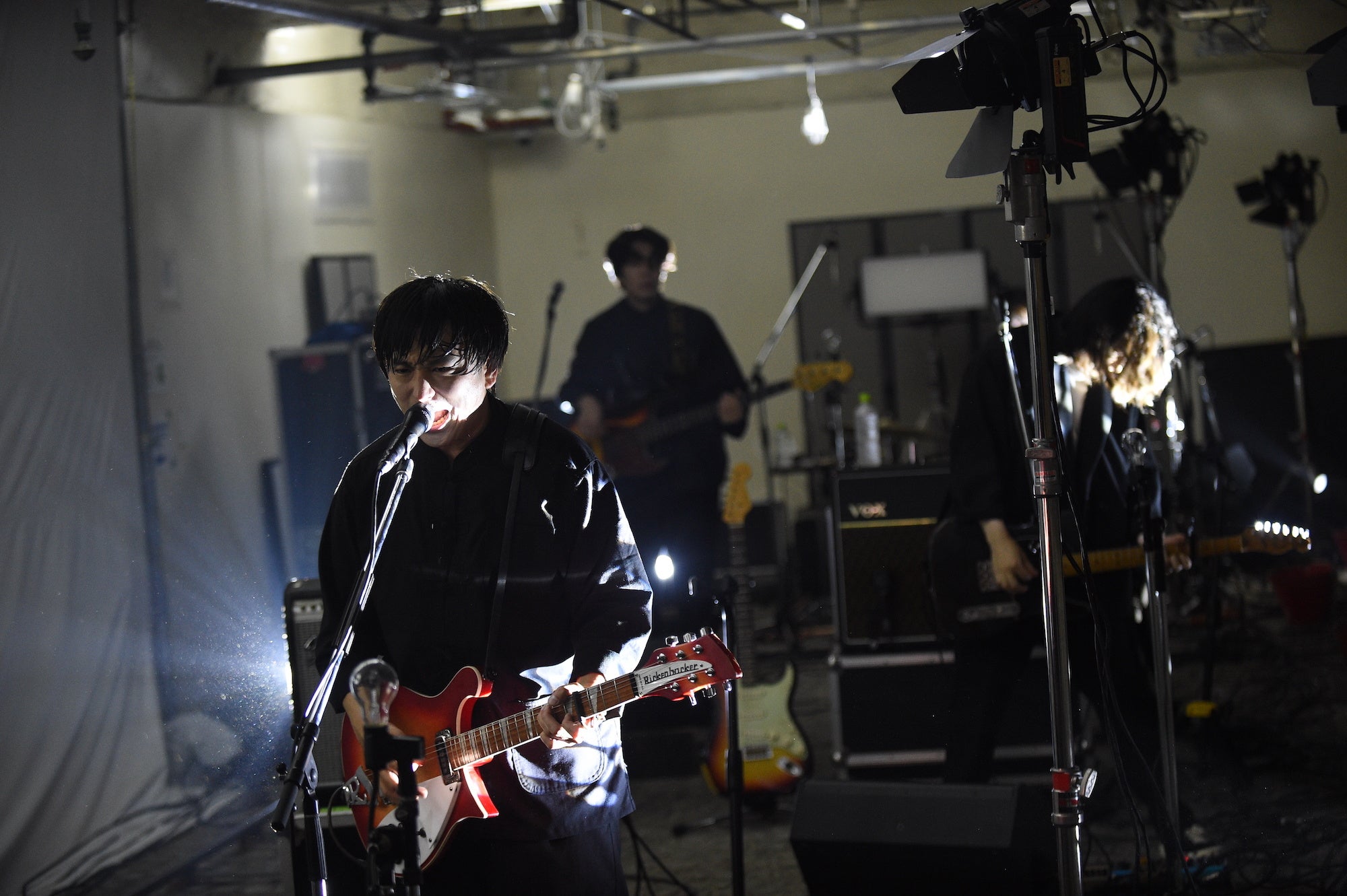タイトなダンスビートで画面越しにオーディエンスを踊らせる「SとF」を軽快に鳴らすと、4人一斉に爆音をぶちかまして「ニヒリズム」へ。持ち場を離れて森に近づいた加藤が長髪を振り乱し、飛び跳ねながらギターをかき鳴らす。森は体全体を大きく揺らしながらベースを弾き、古舘は顔を顰めながら声を振り絞る。ヒリヒリとした焦燥感と熱情がここに来てライブの温度をさらに高める。