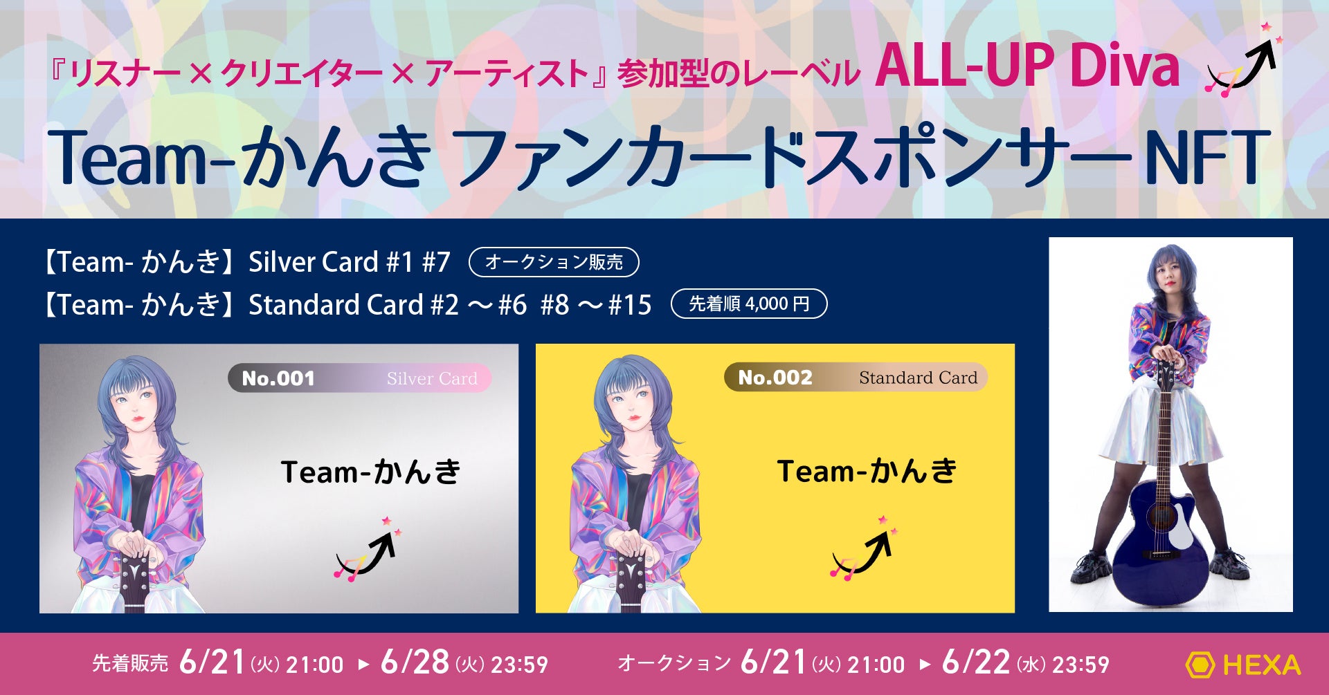 NFTマーケットのHEXA(ヘキサ)では、ALL-UP Divaのアーティスト「かんき」のファンカードのスポンサーNFTを6/21(火)21時から販売します。