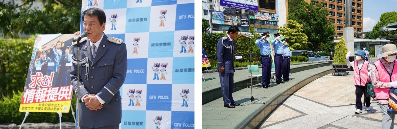 翌日、岐阜県警察本部を訪れた杉対策監は、岐阜駅信長ゆめ広場で行われた『ニセ電話詐欺 被害防止啓発活動』開始式の挨拶のなかで、集まったボランティア団体の方々に対し「社会のため、また警察のために皆さんのお力をお借りできてとても嬉しいです。私も様々な対策を考えていますが、県民の皆さんのお力添えがないと特殊詐欺根絶には至りません。富山県では、防犯団体の協力により、防犯地区の特殊詐欺被害がゼロ件になるなどの事例がありました。それに続けるように一生懸命私たちと頑張っていただきたいです。今後ともよろしくお願いします!」と激励しました。