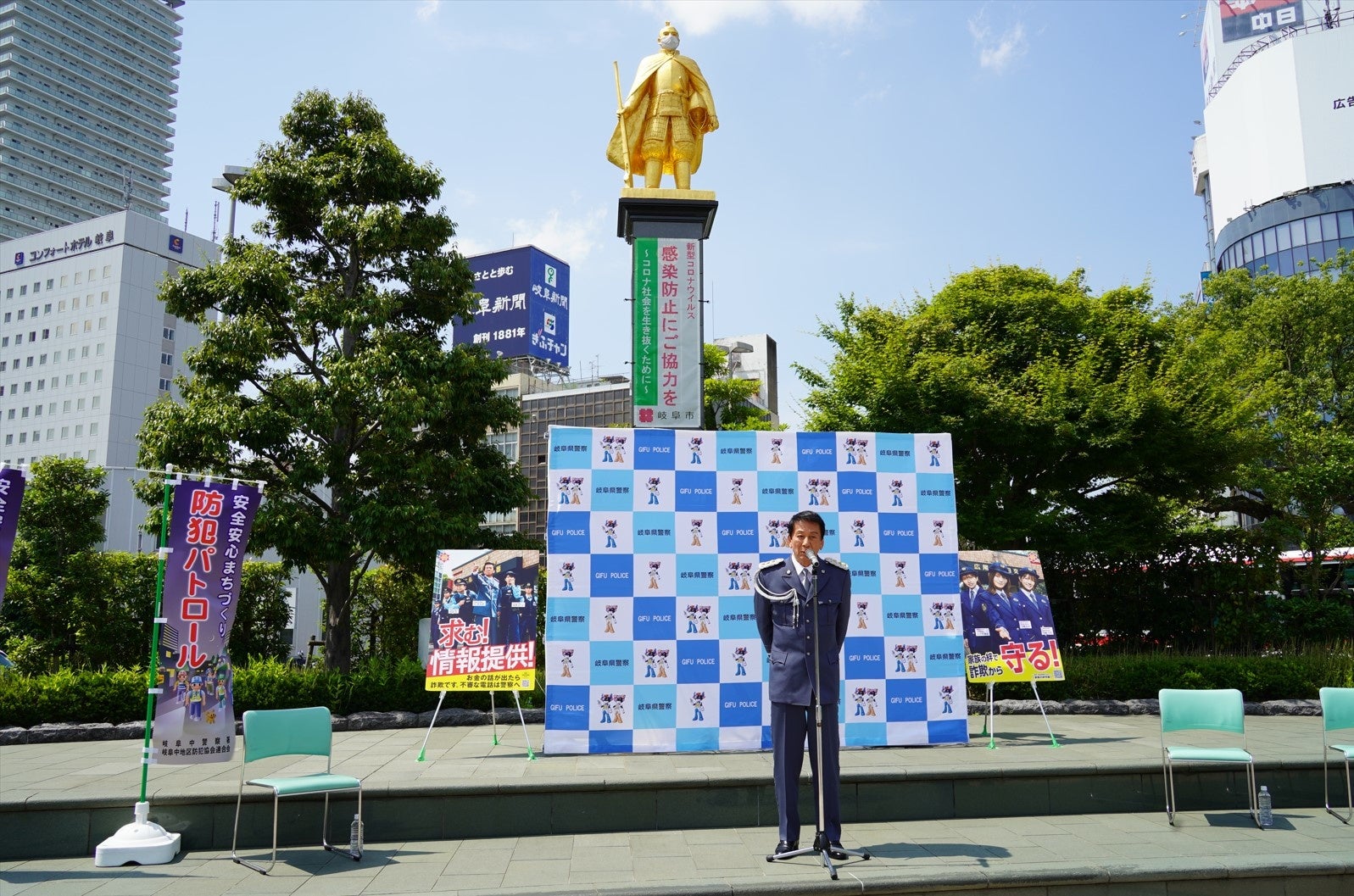 この度、杉良太郎特別防犯対策監が、福井県・岐阜県の各警察本部を訪問しました。岐阜県では、岐阜駅前の織田信長像前で開催された『ニセ電話詐欺 被害防止啓発活動』開始式に出席し、地域の安全を守る防犯ボランティアの方々を激励するとともに、岐阜県民へ特殊詐欺被害防止に向けて、注意を喚起しました。