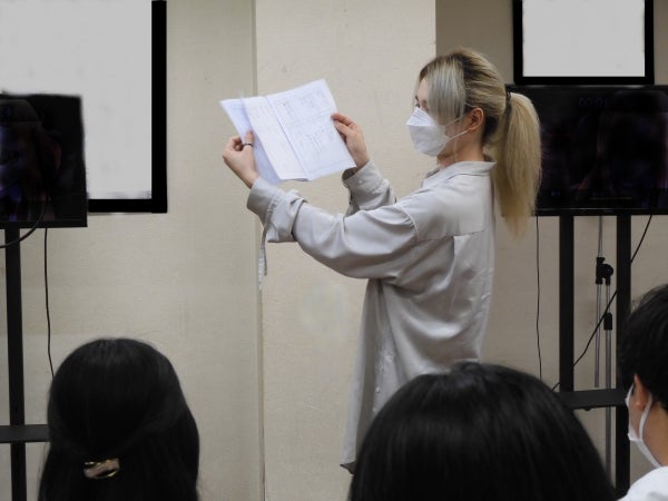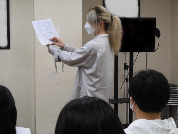 まずは、AMG声優学科のスタッフから、台本の読み方について説明が入ります。参加する方のほとんどが初のアフレコ体験のため、業界用語や分かりづらい箇所について、丁寧に説明。その後、キャスト発表、発声練習、アフレコ体験とイベントが進んでいきます。