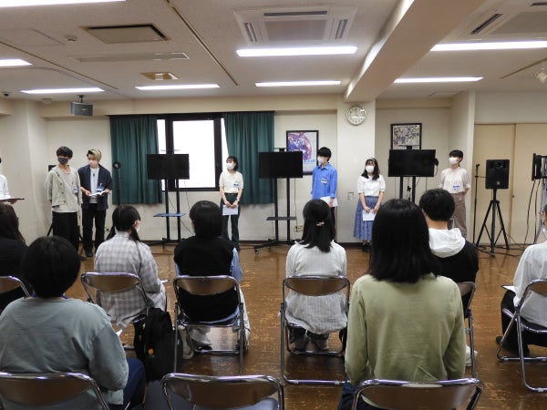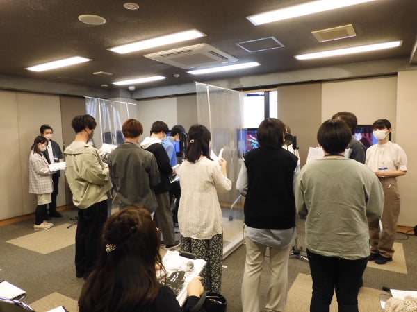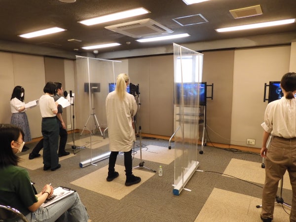アフレコ体験では、4つのチームに分かれ、練習と本番の2回アフレコを行います。声を入れるタイミングや声の出し方については、在校生がしっかりとサポート。不安そうにしている参加者の方に優しく声をかけるなど、AMGの在校生はとても頼りになります。