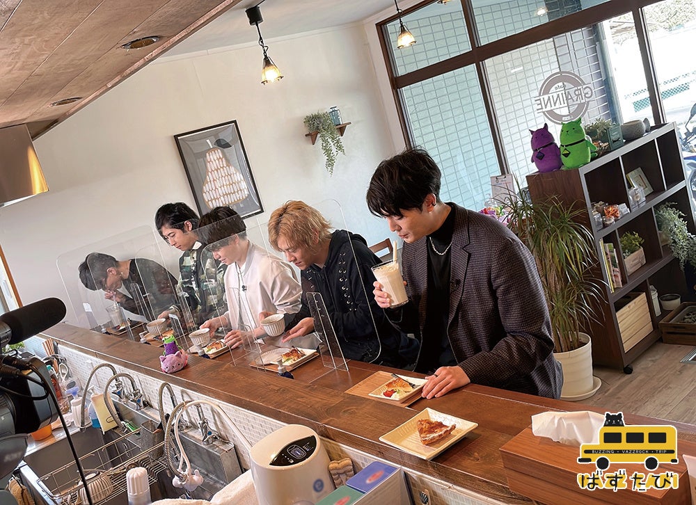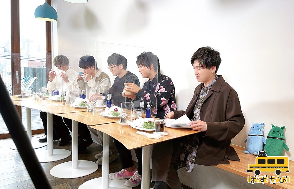 ROCK DOWNは都内をめぐるバス旅。まずは、パンを使った料理やスイーツとコーヒーが自慢のお店でランチをいただきます。プロジェクトスタートの思い出や、バズロの魅力に関する問題が出題される”バズロックイズ”など、バズロについて賑やかトーク! さらに次の目的地へ向かう車中では、それぞれが演じるキャラクターについてをじっくり語ります。
