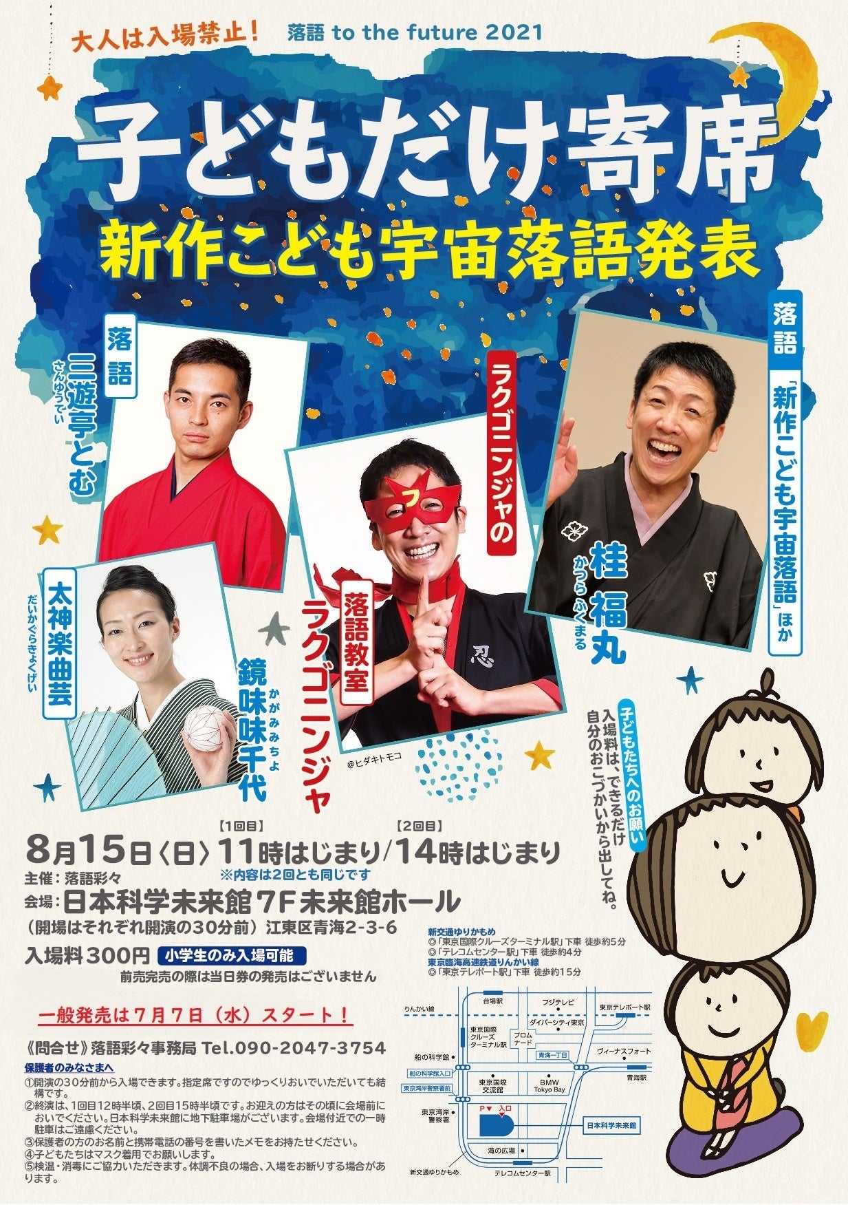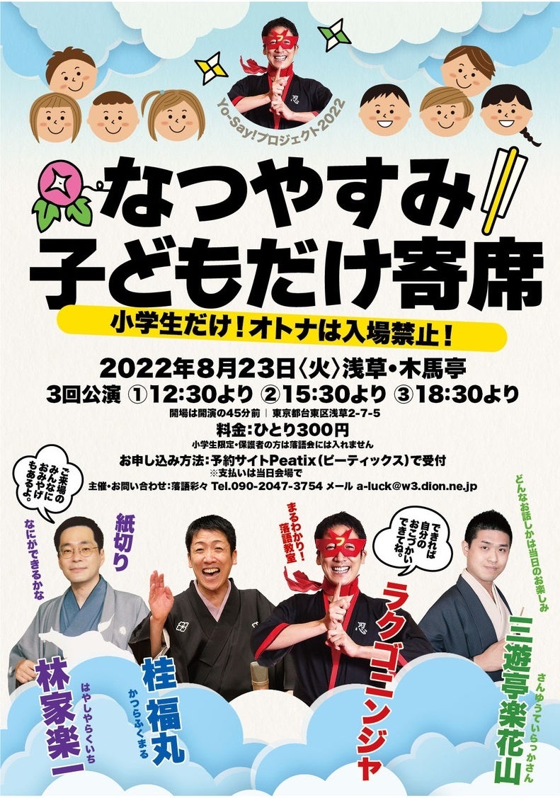 「子どもしか入れない、子どもだけ寄席ってなんだ?」「きいたことないよ」という記者さんのために、「おもしろくて笑える」記者発表を都内のおしゃれタウン中目黒のスタジオで行います。ぜひ、おいでください。リモートがいいという方にはZOOMもあります。
