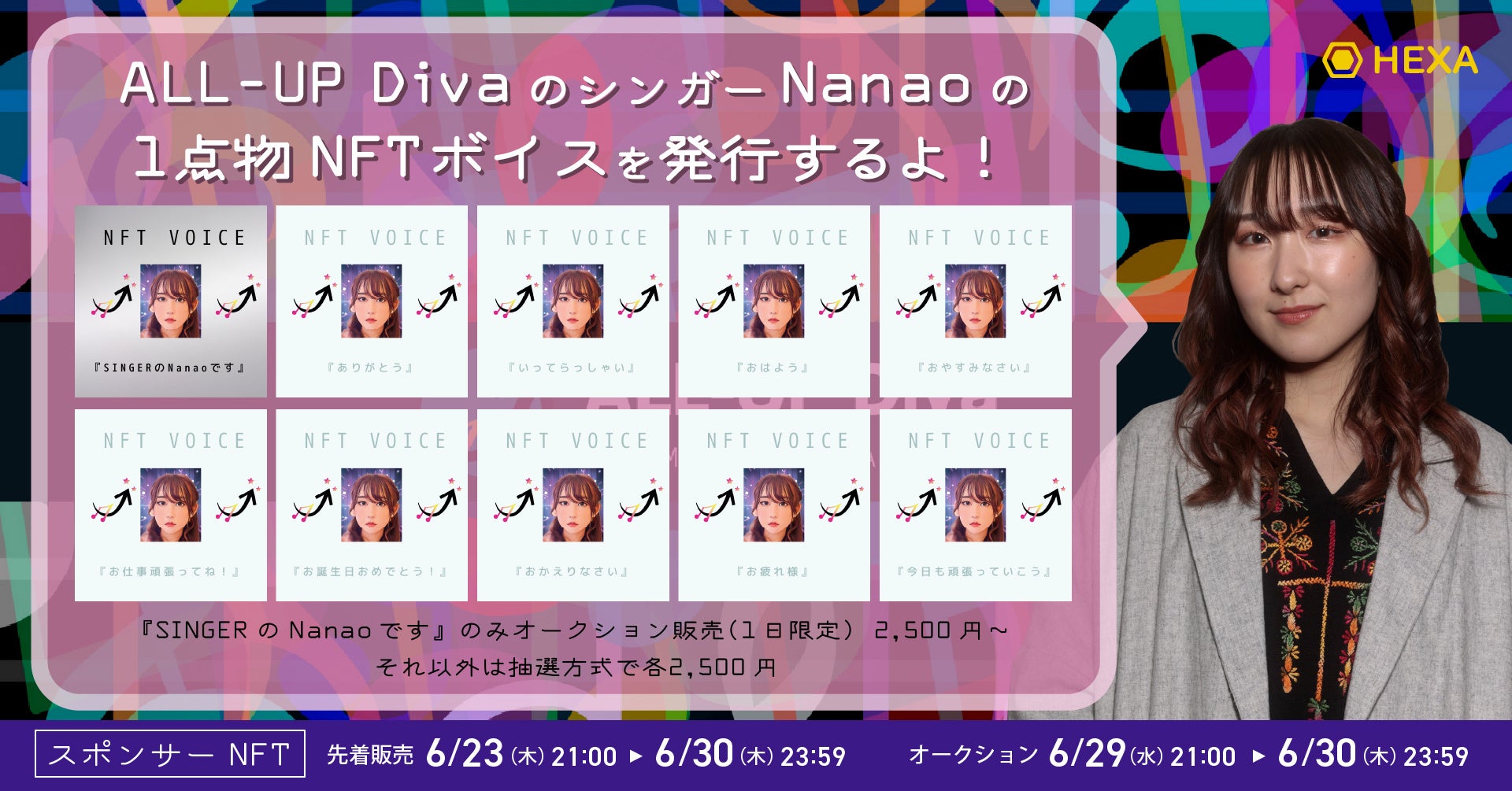 NFTマーケットのHEXA(ヘキサ)では、ALL-UP DivaのアーティストNanaoのボイスNFTをスポンサーNFTとして6/23(木)21時から販売します。