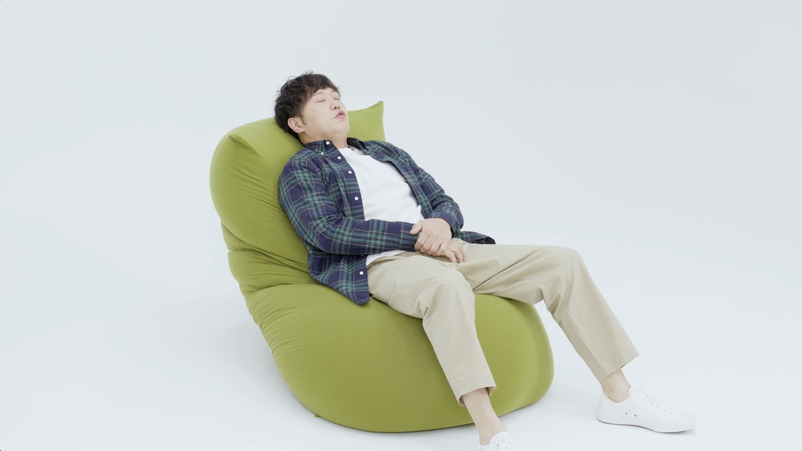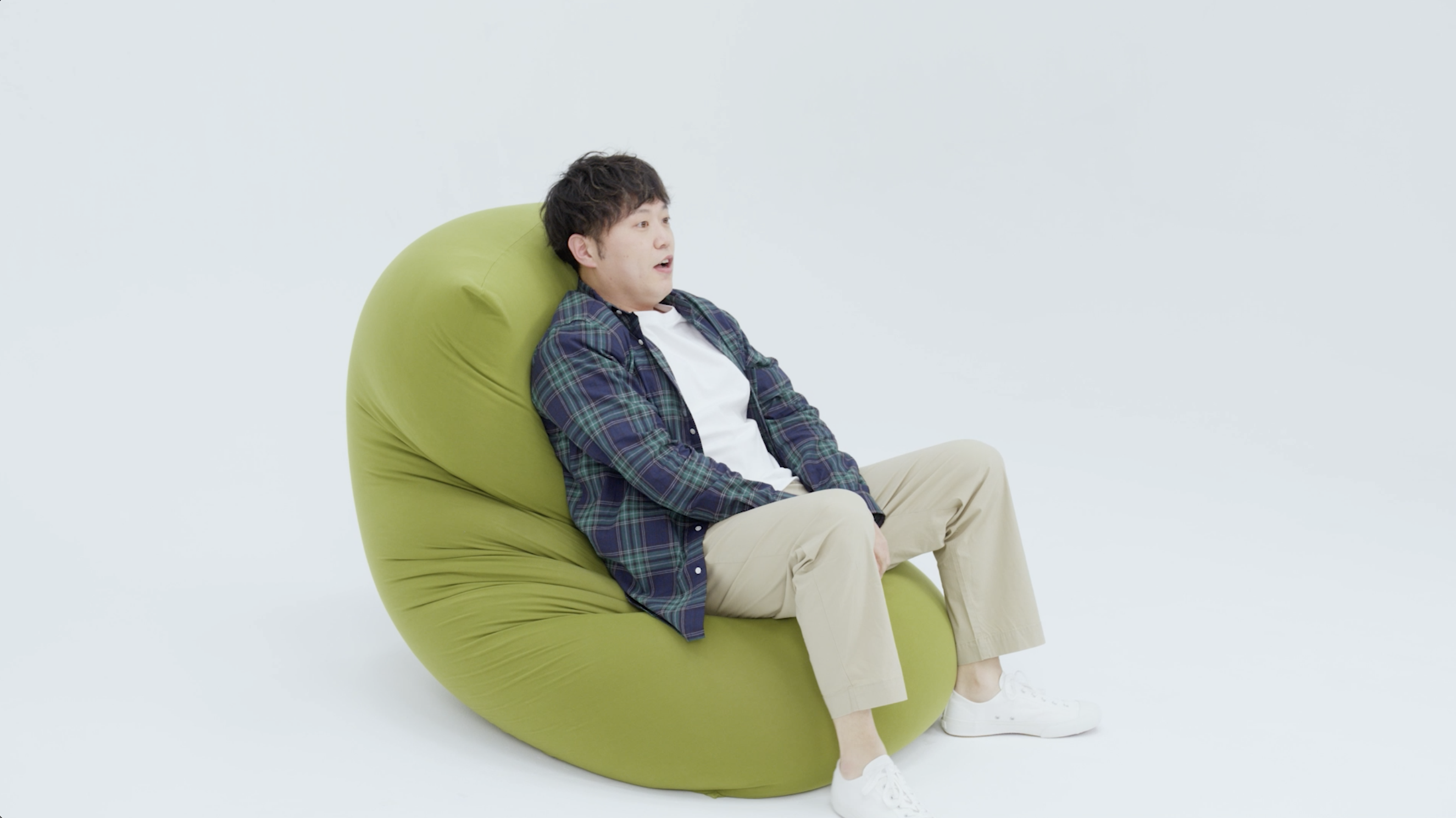 普段から愛用している Yogibo Maxの魅力を解説するエハラさん。「これ一番びっくりしたんですけど….」とYogibo Maxを立ててそこにもたれると、「このままイスになるんですよ!しかも、もたれても全然後ろにバタンってならないんですよ…」とYogibo Maxの隠れた魅力を語り、そのままリラックスした表情に。最後にはお決まりのサイドスピンを披露し、ご機嫌な様子でポーズを決められていました。