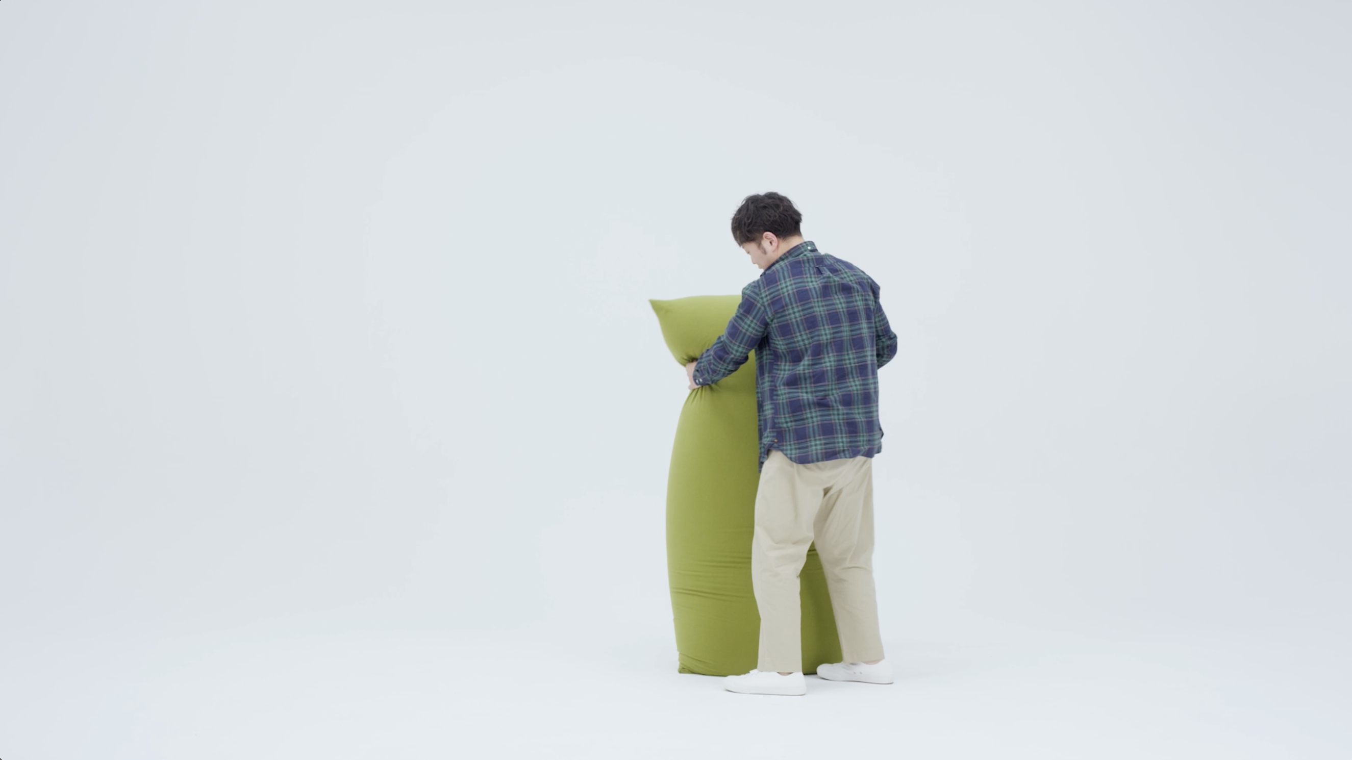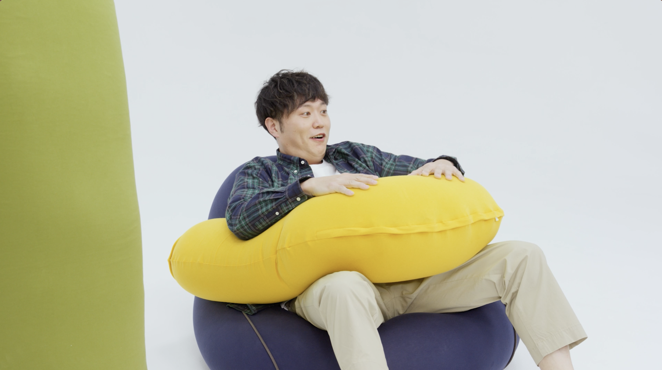 Yogibo Loungerに座り、他のYogiboを組み合わせた新しいお気に入りの座り方を模索するエハラさん。Yogibo Support を手に取り、「こうやったらええんちゃう?」おなかを囲うように手に取ると、興奮した様子で「これめっちゃいい!」とコメント。前と後ろをYogiboに包まれる新たな座り方を発見し、大満足の様子でした。