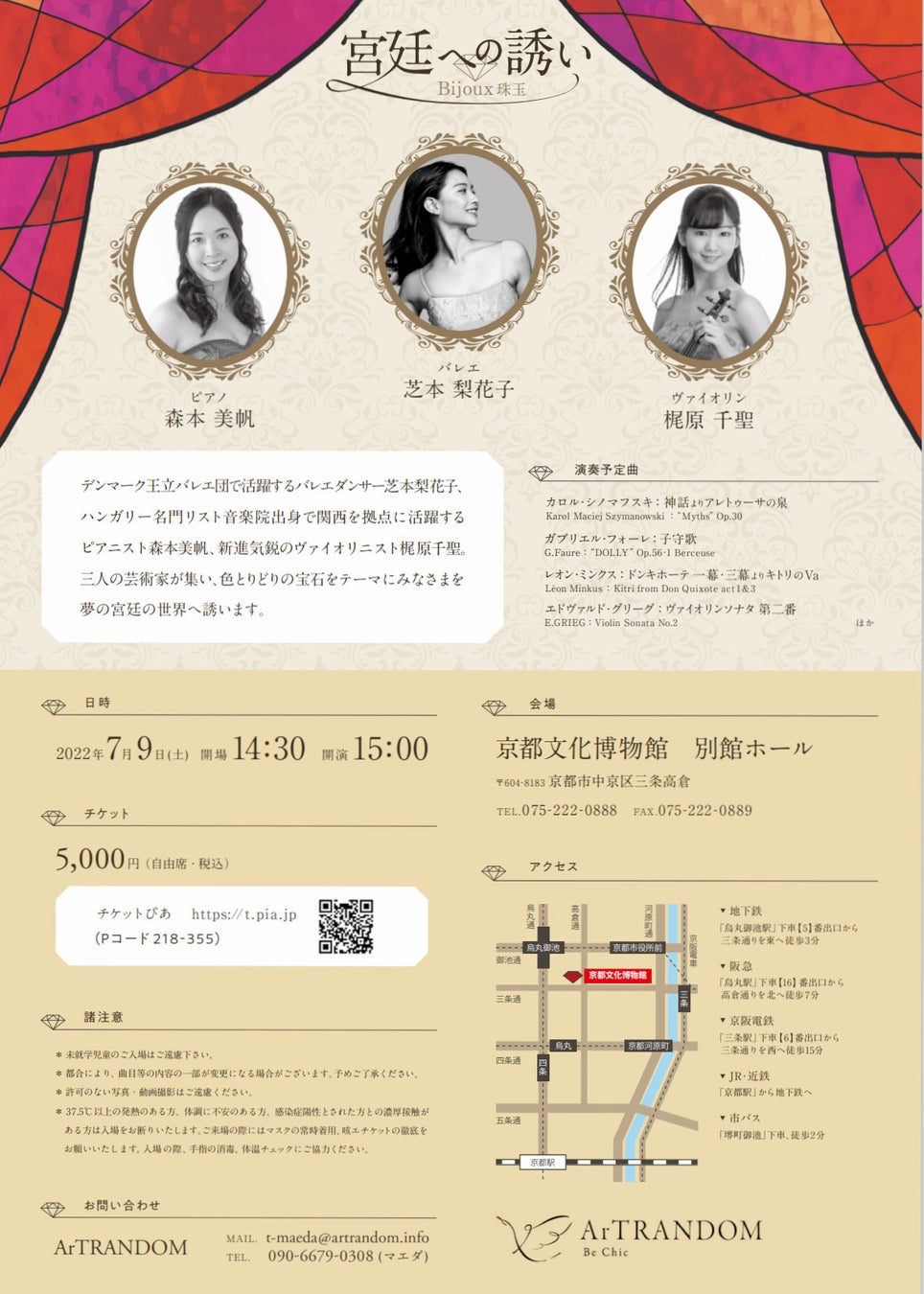 ArTRANDOM(代表:前田哲央)主催、『宮廷への誘い Bijoux 珠玉』が2022年7月9日 (土)に京都文化博物館 別館ホール(京都府京都市)にて開催されます。