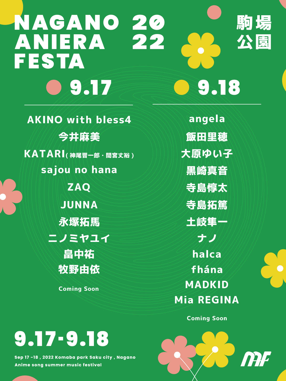 そして新たに、TVアニメ「プリパラ」シリーズや「アイドルマスター シンデレラガールズ」など、人気作品の声優を務め、アーティストとしても活躍し2019年以来2度目の出演となる牧野由依、TVアニメ「モブサイコ100 Ⅱ」のOPテーマ『99.9』やEDテーマ『メモセピア』などが話題となり、8月24日にリリースする『天灯』がTVアニメ「ダンジョンに出会いを求めるのは間違っているだろうかⅣ 新章 迷宮篇」OPテーマに起用されるなど注目のアーティスト・sajou no hanaが9月17日(土)に出演決定。翌18日(日)は、人気TVアニメの主題歌を担当し今注目の本格派アニソンボーカルユニットMia REGINA、8月にニューシングルのリリースを控え9月には7th LIVE 『Help Me!!!!!!! & live playground #003』が決まった人気のニューフェイス・halcaが昨年よりリベンジ出演を果たします。さらに、現在大ヒット上映中の劇場版「からかい上手の高木さん」主題歌を務める大原ゆい子、TVアニメ「蒼穹のファフナー』、「K」、「シドニアの騎士」、「乙女ゲームの破滅フラグしかない悪役令嬢に転生してしまった…」などの大人気アニメを数々の名曲で盛上げてきたアニソンファンの絶対的存在であるangelaのナガノアニエラフェスタ初出演が決定! 野外アニソンフェスでしか見ることできないアーティストたちの姿をぜひご覧ください。