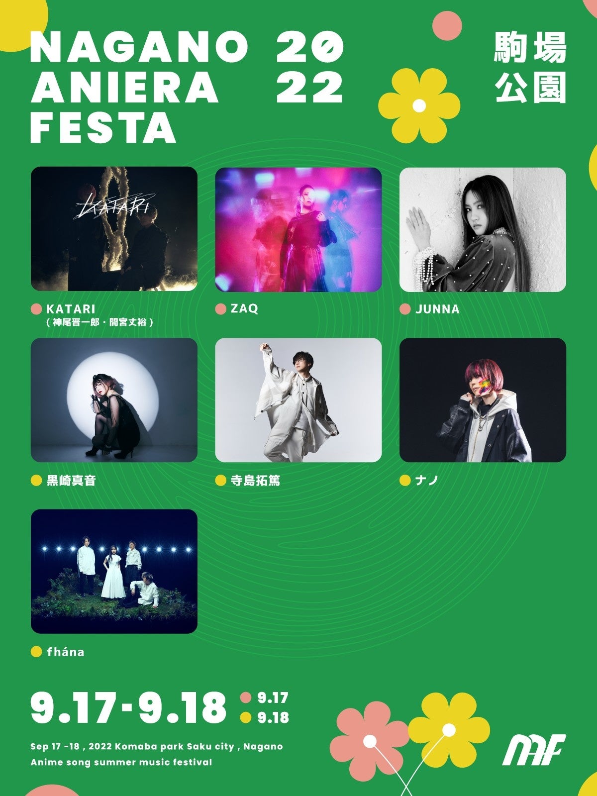 2ステージで構成され、各ステージで違う楽しみ方ができる野外アニソンフェス・アニエラ。これまで発表した今年の出演者は、17日のAKINO with bless4、今井麻美、KATARI、ZAQ、JUNNA、永塚拓馬、ニノミヤユイ、畠中祐、18日の飯田里穂、黒崎真音、寺島惇太、寺島拓篤、土岐隼一、ナノ、fhánaとなっています。