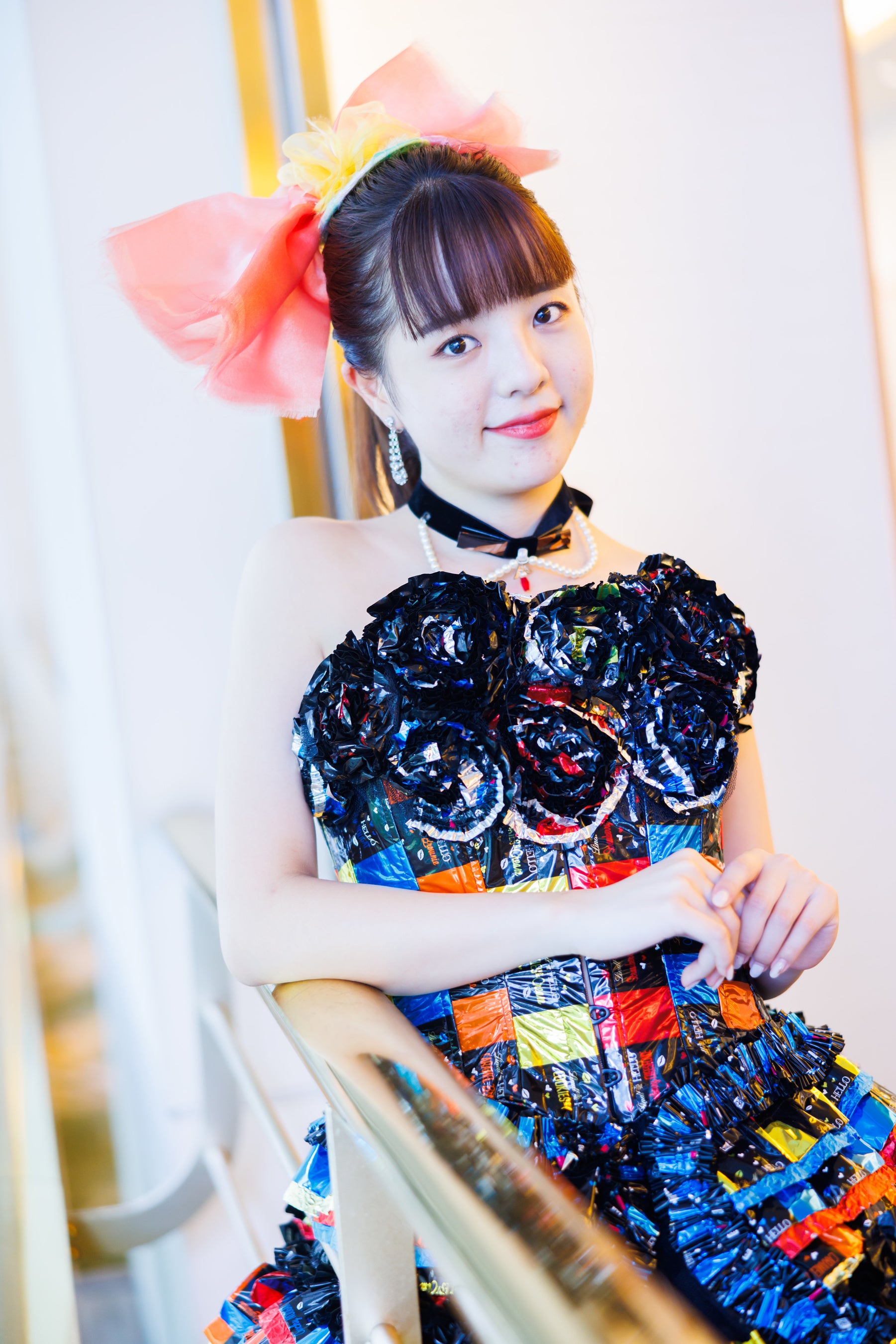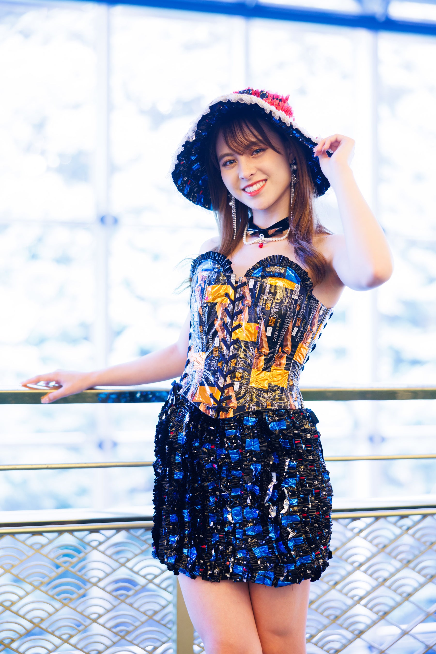 ファッションブランド「リ・サイクル・スタイル」のチョコレートの包み紙で作られたドレス着用。材料で使われたチョコレートを来場者へ配った