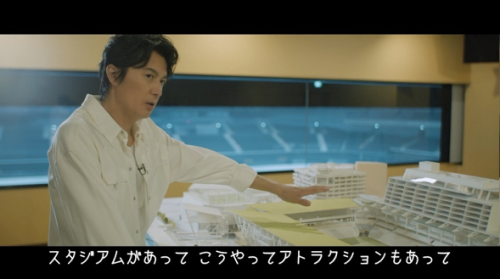 ・長崎スタジアムシティの模型を前に語るインタビューシーンも