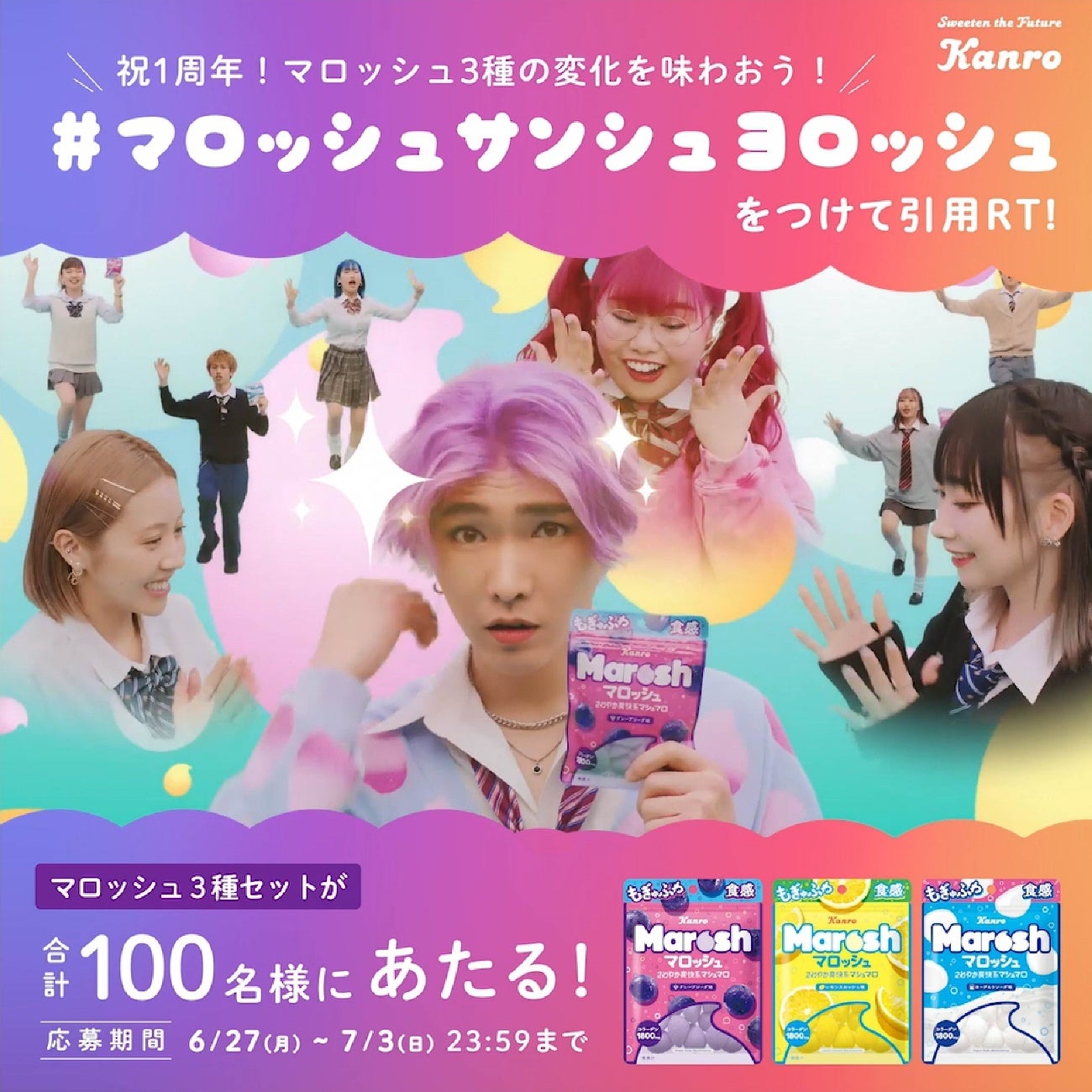 不思議な新食感で話題の「マロッシュ」は今年6月で発売から1周年を迎えました。そこで、「マロッシュ」発売1周年を記念して、グレープソーダ味、レモンスカッシュ味、そして明日6月28日(火)より発売となる新フレーバー・ヨーグルトソーダ味の3種セットを合計100名様にプレゼントするSNSキャンペーンを実施します。