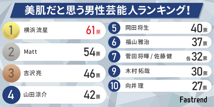 ファストレンド(運営会社:株式会社NEXER)は、「美肌だと思う男性芸能人」に関するアンケートを実施し、結果をサイト内にて公開したので紹介します。