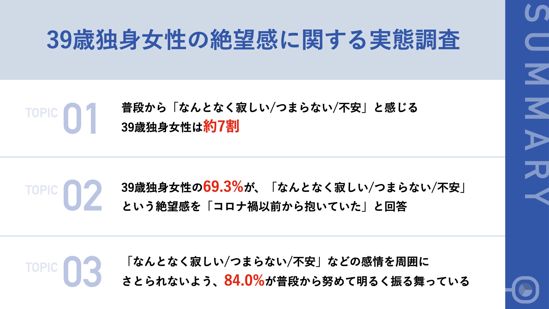 - 39歳独身女性の約7割が、普段から「なんとなく寂しい/つまらない/不安」と感じている