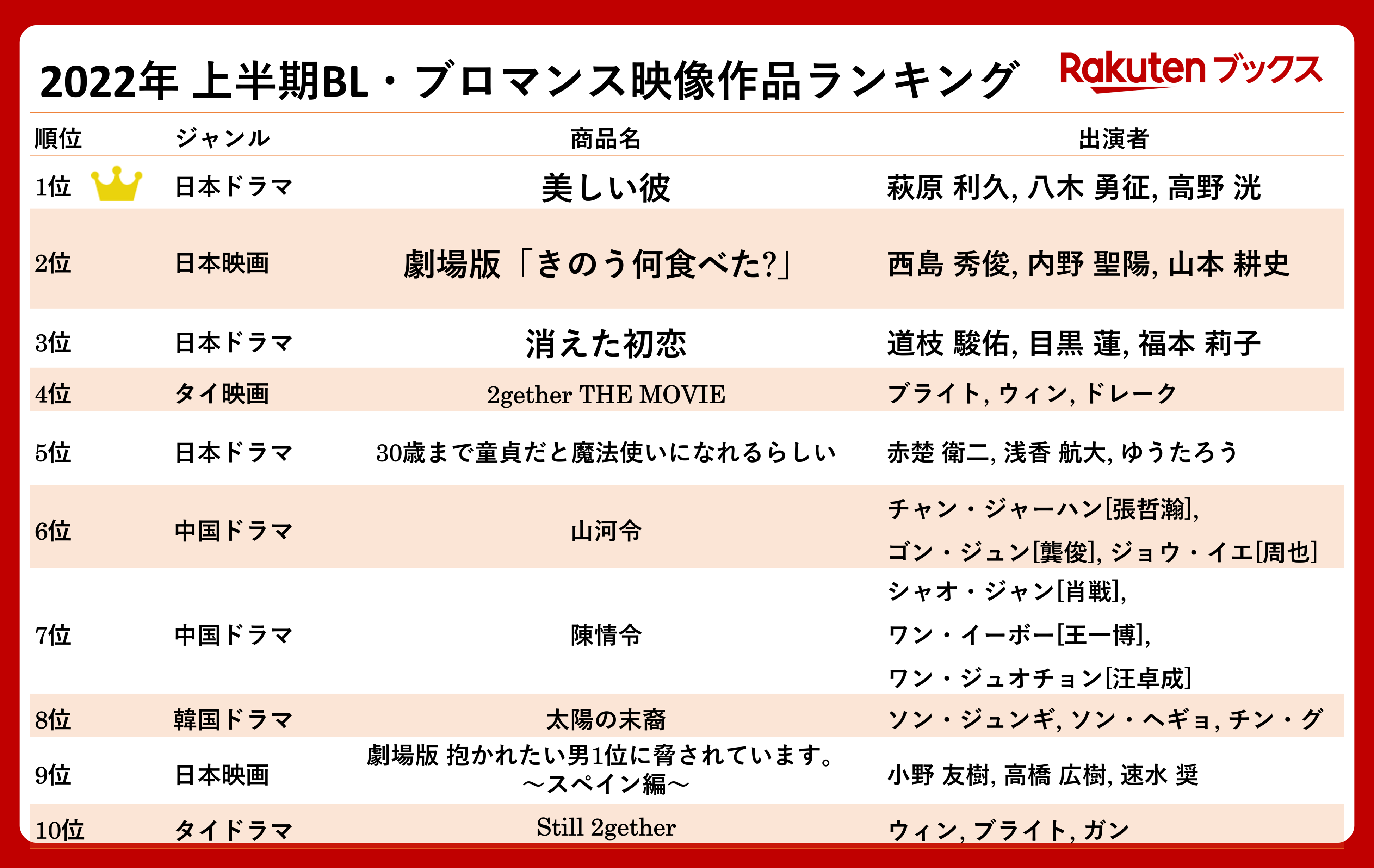 ・「楽天ブックス」2022年 上半期BL・ブロマンス映像作品ランキング