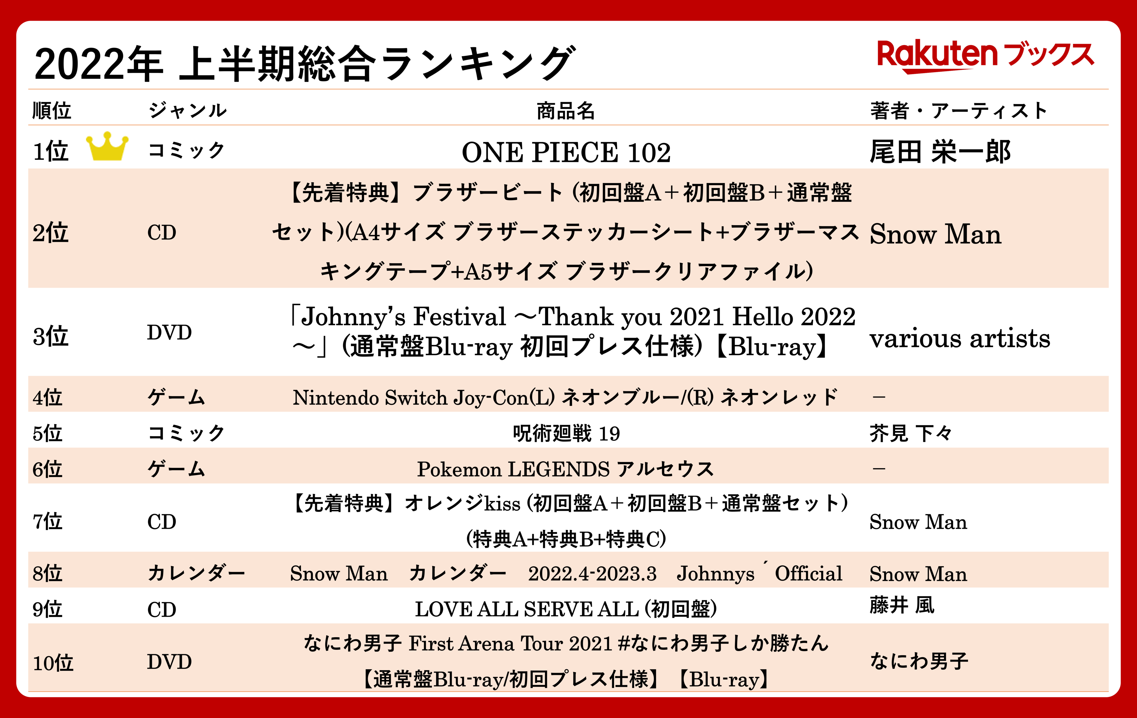 ■「楽天ブックス」2022年 上半期総合ランキング