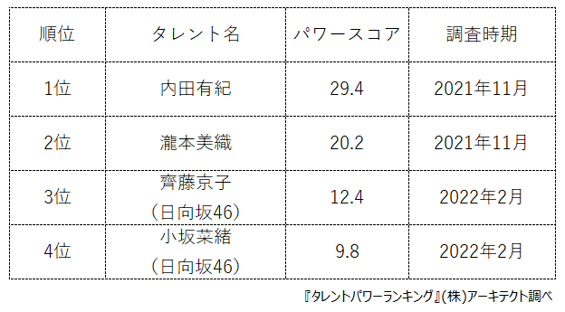 本ランキングは、2022年2月度に実施したタレント調査データ(一部過去実施データ)を利用し、タイトルに応じてランキング形式でまとめたものです。