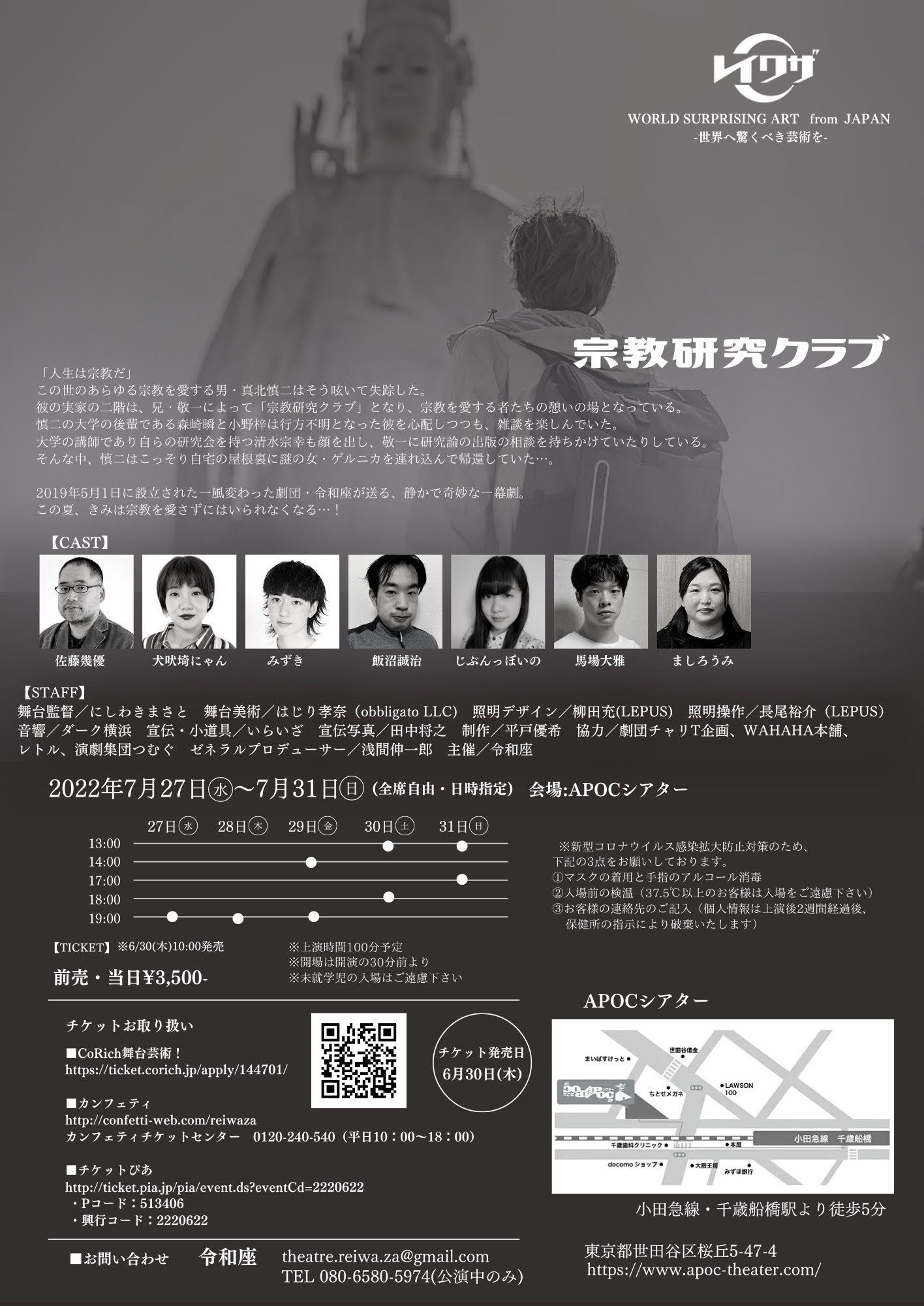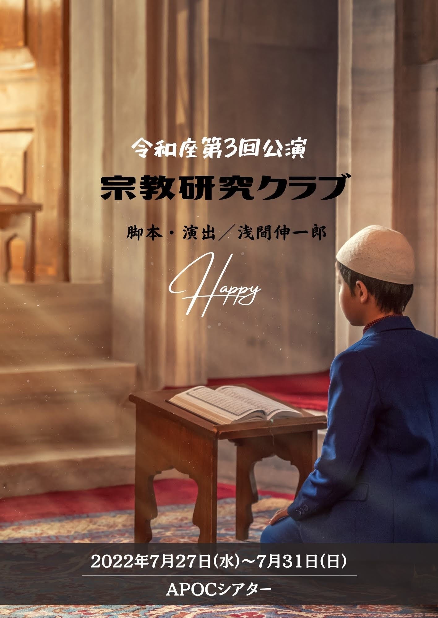 令和座(主宰:浅間伸一郎)主催、『宗教研究クラブ』が2022年7月27日(水)~7月31日(日)にAPOCシアター(東京都世田谷区)にて上演されます。
