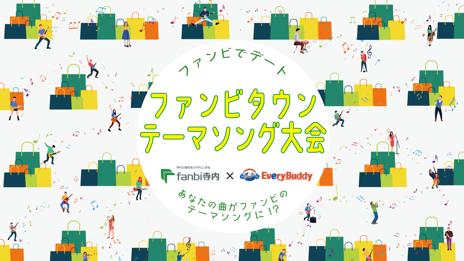 音楽プレイヤーに活躍の場を提供することで応援する株式会社Every Buddy(共同代表:松本恵・大橋優也、以下Every Buddy)は、大阪・九州にて店舗型総合卸問屋「ファンビ寺内」を運営する寺内株式会社(代表取締役:末永義博、以下寺内)の協力のもと、プロ・アマチュア問わず音楽活動をしている人が誰でもオリジナル作曲作品で応募することができる<ファンビでデート >『ファンビタウンテーマソング大会』を2022年6月30日から開催いたします。