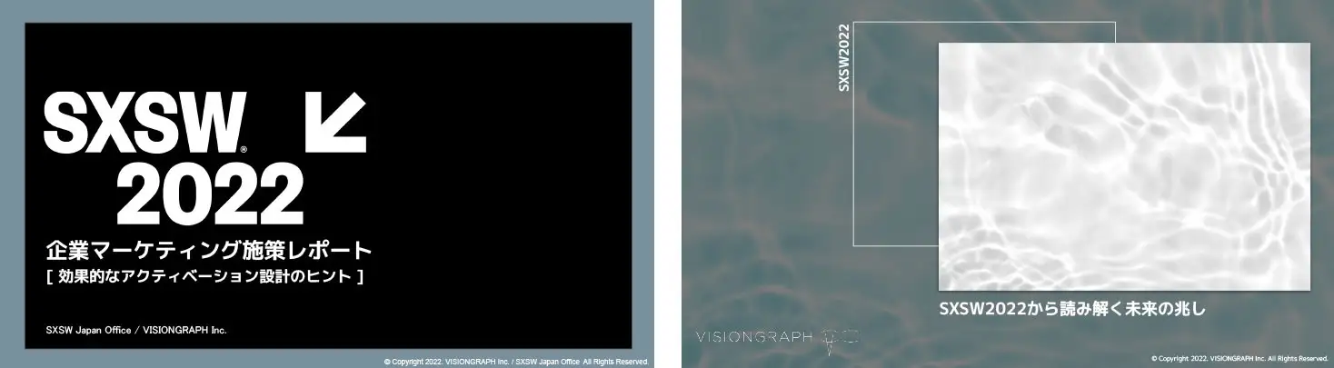 SXSW Japan Office / VISIONGRAPHではSXSW2022に関する2つのレポートを無料公開しています。下記のリンクからそれぞれダウンロードが可能ですので、是非カンファレンスへの応募や展示会への出展、マーケティングのヒントを探してみてください。
