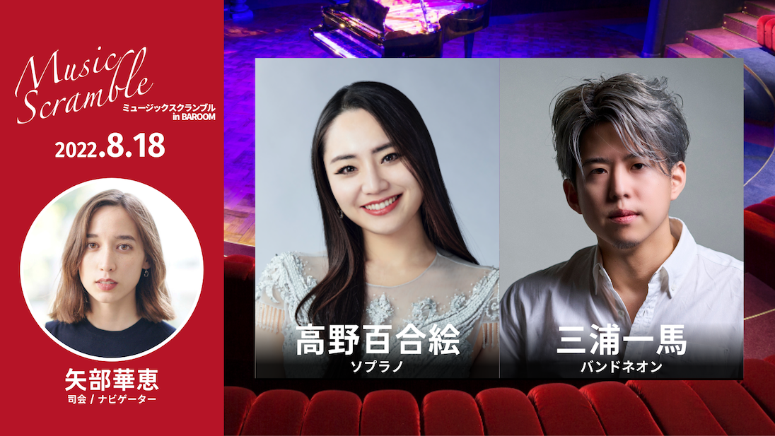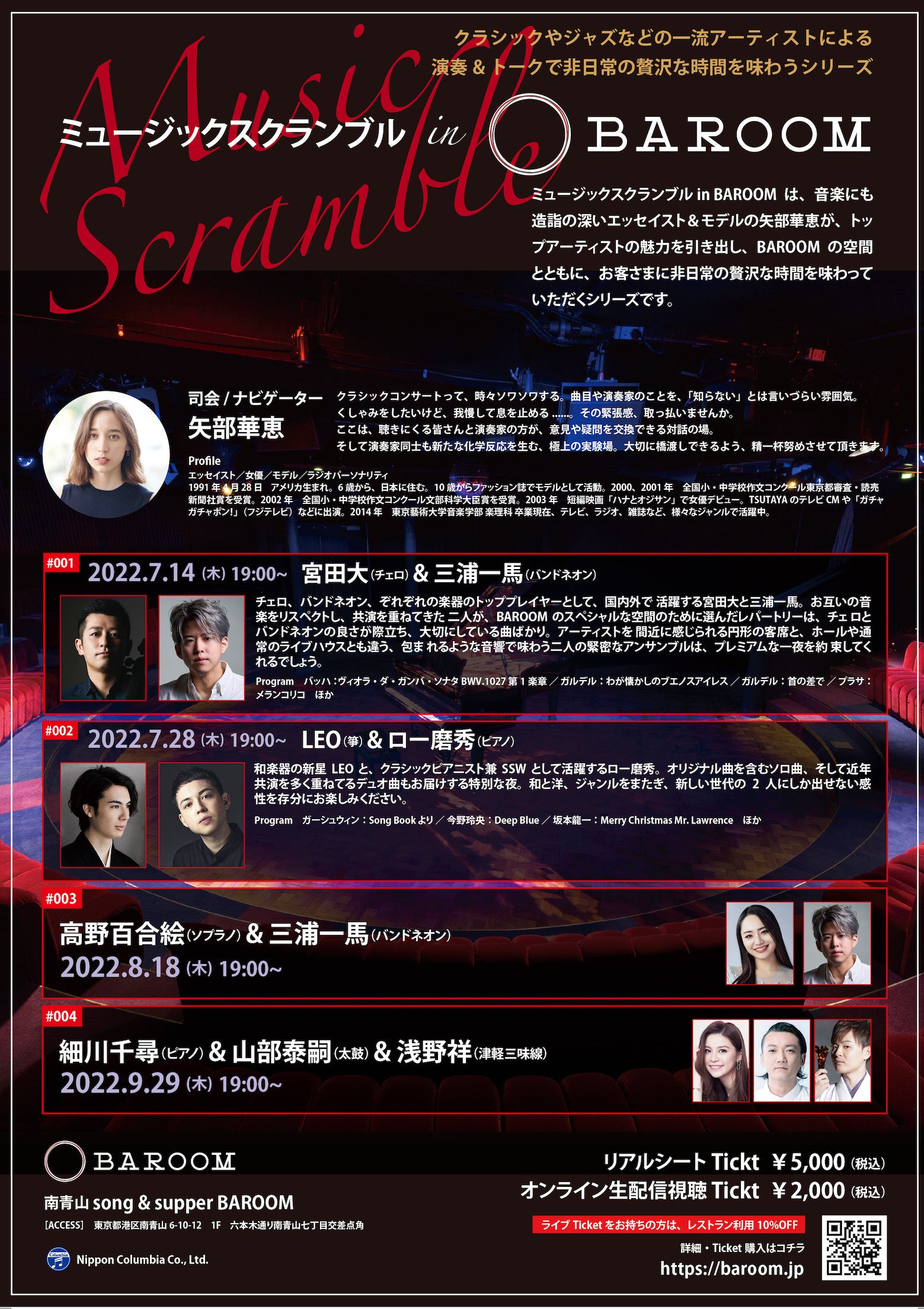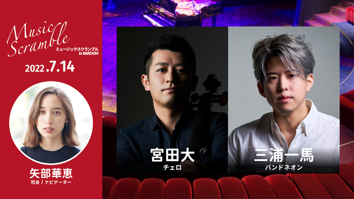 『ミュージックスクランブル in BAROOM』第1回は、チェロの宮田大とバンドネオンの三浦一馬というそれぞれの楽器のトップ奏者が共演する。お互いの音楽をリスペクトし、共演を重ねてきた二人が、BAROOMの音楽空間を活かしたスペシャルプログラムを組んだ。ホールや通常のライブハウスとも違う、包まれるような音響で味わう二人の緊密なアンサンブルは、プレミアムな一夜限りのライブとなる。