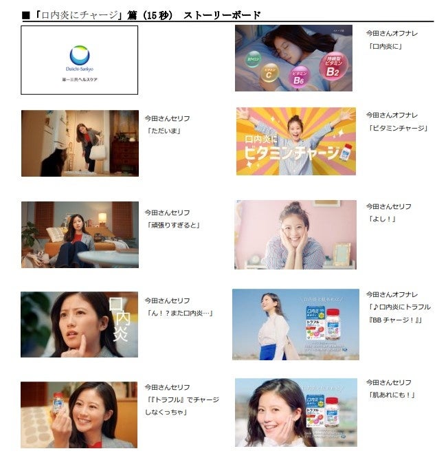 第一三共ヘルスケア株式会社(本社:東京都中央区)は、女優・今田美桜さんを起用したトラフルシリーズの新TV-CM「口内炎にチャージ」篇を、本年7月1日(金)より全国で放映いたします。今田美桜さんは2019年にトラフルのブランドキャラクターとして初登場、今回は2作目の出演。口内炎に悩んだ経験を持つ人なら思わず共感してしまうような等身大の姿をいきいきと演じ、好評を博しています。