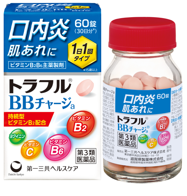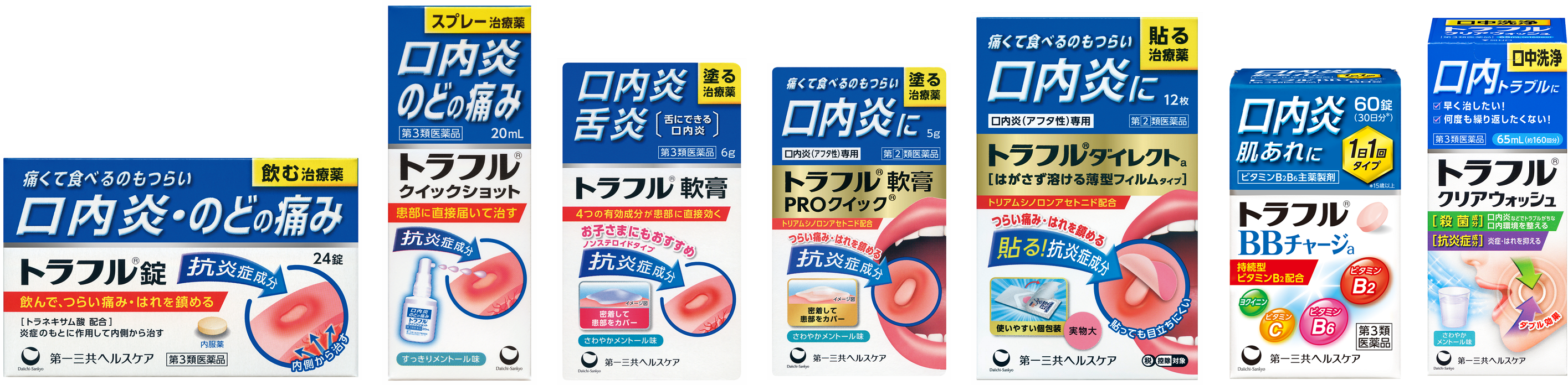 ラインアップは、飲むタイプ「トラフル錠」、スプレータイプ「トラフル クイックショット」、塗るタイプ「トラフル軟膏」、「トラフル軟膏PROクイック」、貼るタイプ「トラフルダイレクトa」の口内炎治療薬シリーズ5アイテムと、ビタミンB2B6主薬製剤「トラフルBBチャージa」、うがいによる殺菌・消毒により口内環境を整える「トラフルクリアウォッシュ」の計7アイテム。口内炎の発症部位や症状に合わせて提案しています。