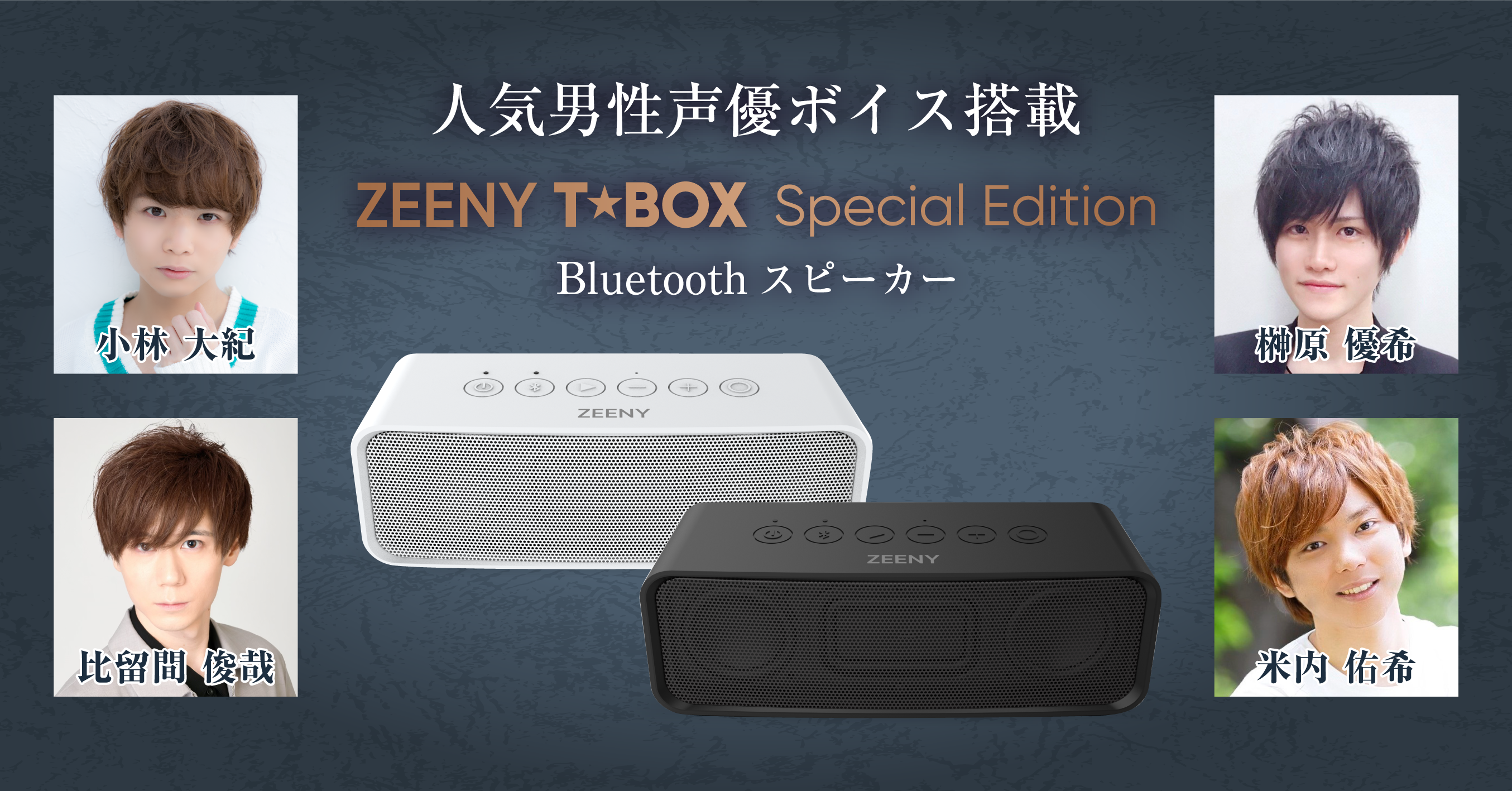 株式会社ネイン(本社:東京都渋谷区、代表取締役:山本健太郎)は、音場拡張技術 Virtual Sound Field™ 搭載Bluetoothスピーカー『Zeeny T★Box』に、人気声優の『小林 大紀』『榊原 優希』『比留間 俊哉』『米内 佑希』の操作音が搭載された「Special Edition」を期間限定で販売します。