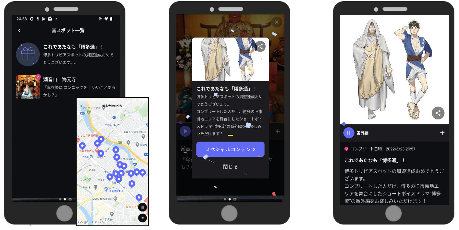 ※順に音スポット画面イメージ、コンプリート画面イメージ、オリジナルストーリー画面イメージ