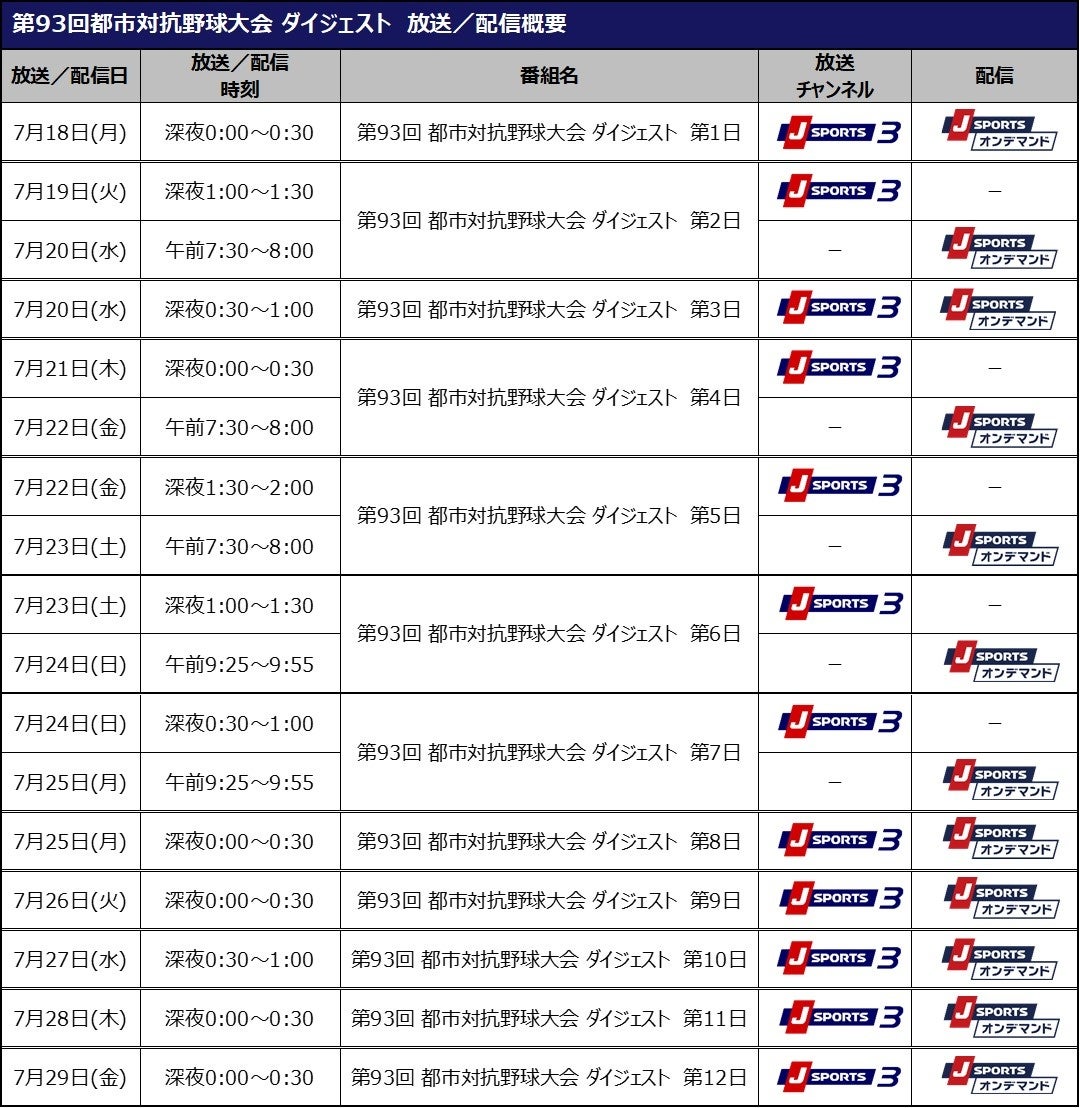 そして大会期間中は、 J SPORTS野球好き公式Twitterにて、各試合のスーパープレーとハイライトを連日投稿し、本大会の魅力を多くの野球好きに発信いたします。また、各日の試合を振り返るダイジェスト番組も連日放送・配信でお届けいたします。