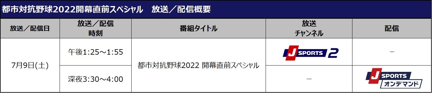 J SPORTSでは本大会の中継のみならず、大会前には都市対抗野球の魅力をさまざまな角度からお伝えする「都市対抗野球2022開幕直前スペシャル」を放送・配信し、大会を更に盛り上げていきます。さらに、J SPORTS公式YouTubeチャンネルでは、本大会に出場経験のある広島東洋カープ・末包昇大選手(大阪ガス/2020~2021年出場)が大会の思い出を当時の映像と共に振り返るインタビュー動画を無料配信いたします。