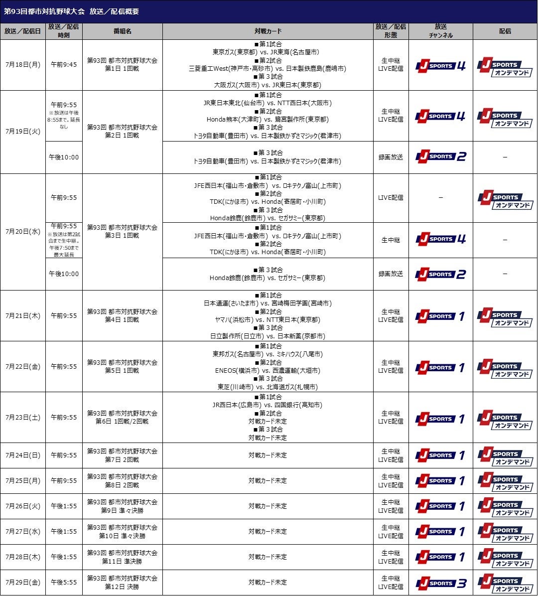 国内最大4チャンネルのスポーツテレビ局、株式会社ジェイ・スポーツ(本社 東京都江東区、代表取締役社長 長谷一郎、以下「J SPORTS」※1)は、7月18日(月)に開幕する「第93回 都市対抗野球大会」を全試合放送いたします。また、 PC/スマホ/タブレットでご視聴いただける動画配信サービス「J SPORTSオンデマンド」※2では全試合をLIVE配信でお届けいたします。