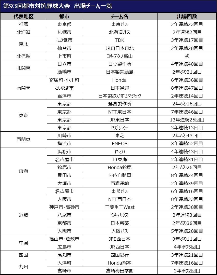 社会人野球の象徴「都市対抗野球大会」は、日本野球連盟(JABA)主催の社会人野球最高峰の大会です。今大会は、東京ドームを舞台に7月18日(月)から7月29日(木)まで12日間に渡って、昨年の覇者・東京ガス(東京都)と全国各地区の予選を勝ち上がった31チームの合計32チームが日本一の座をかけた激戦を繰り広げます。